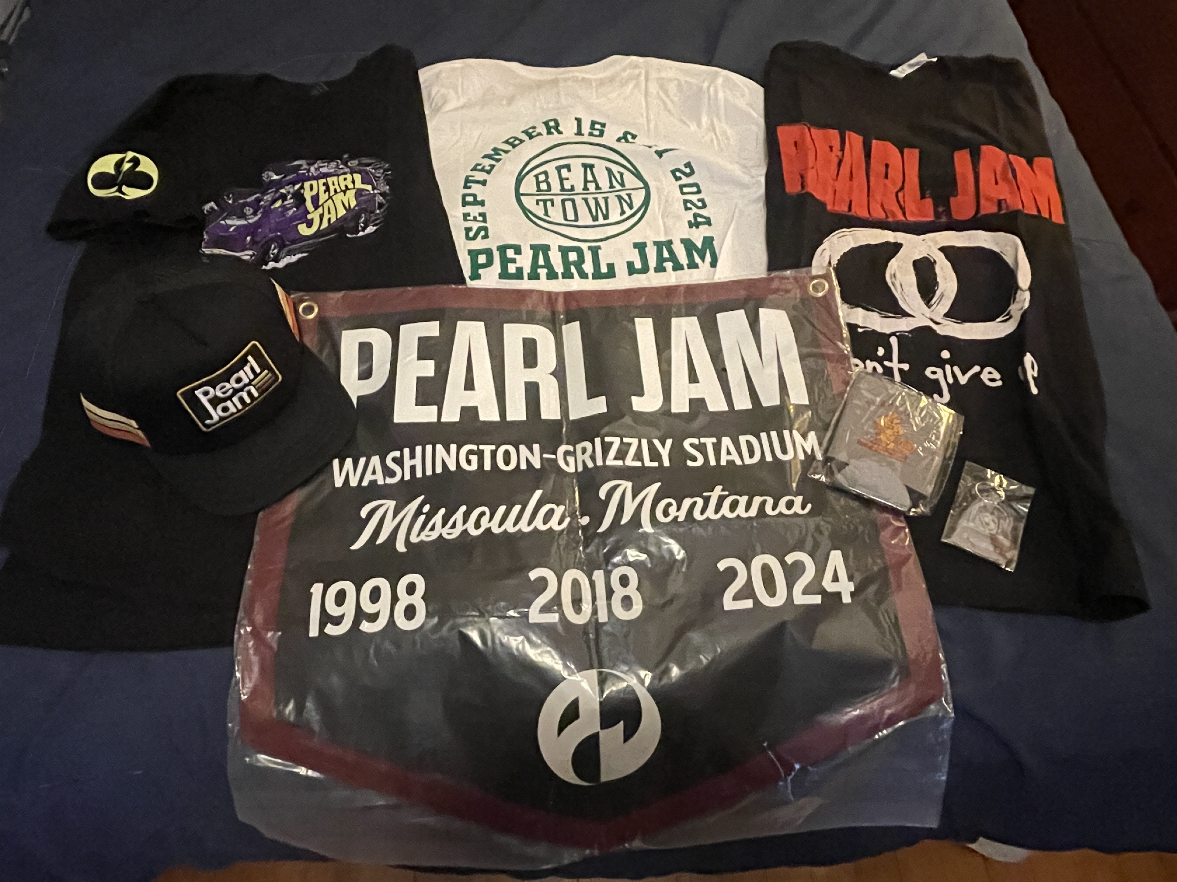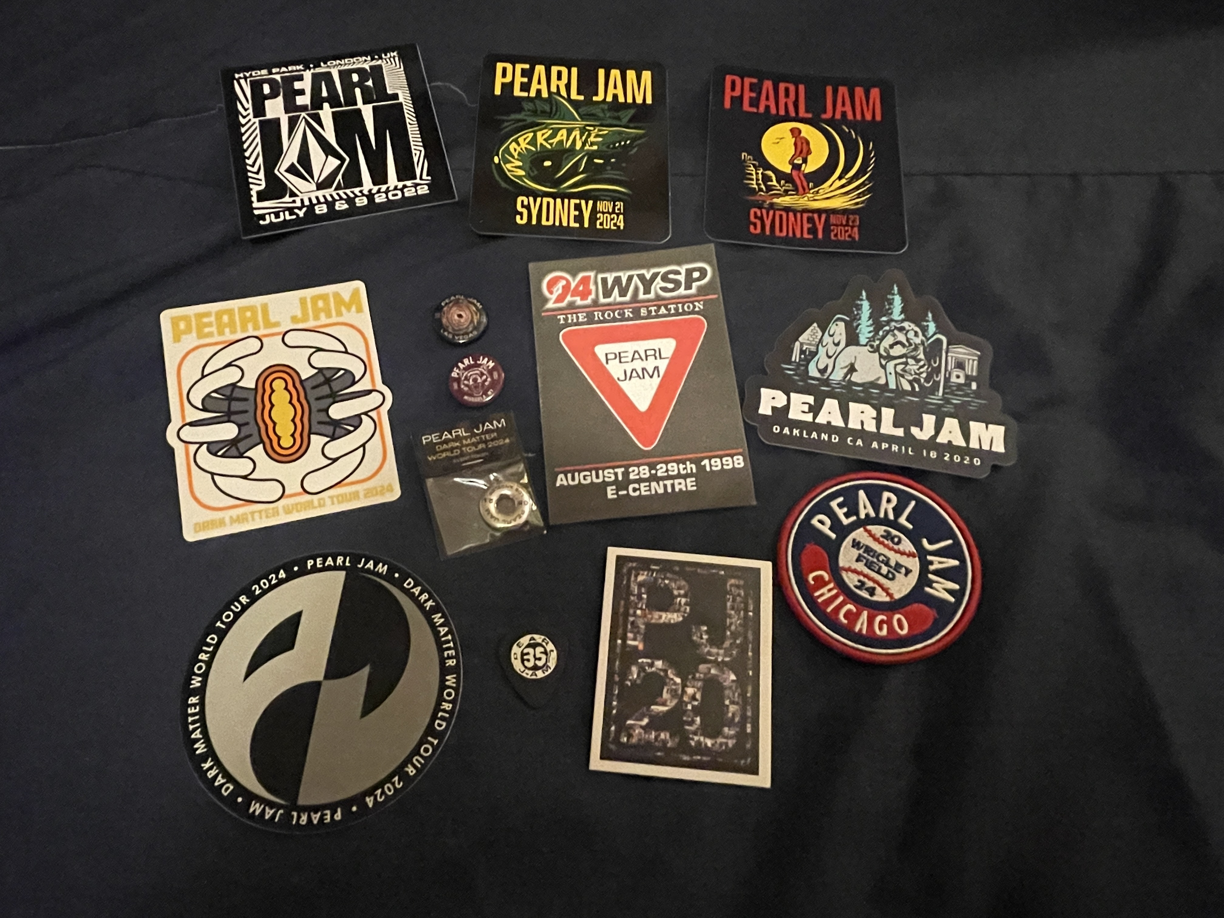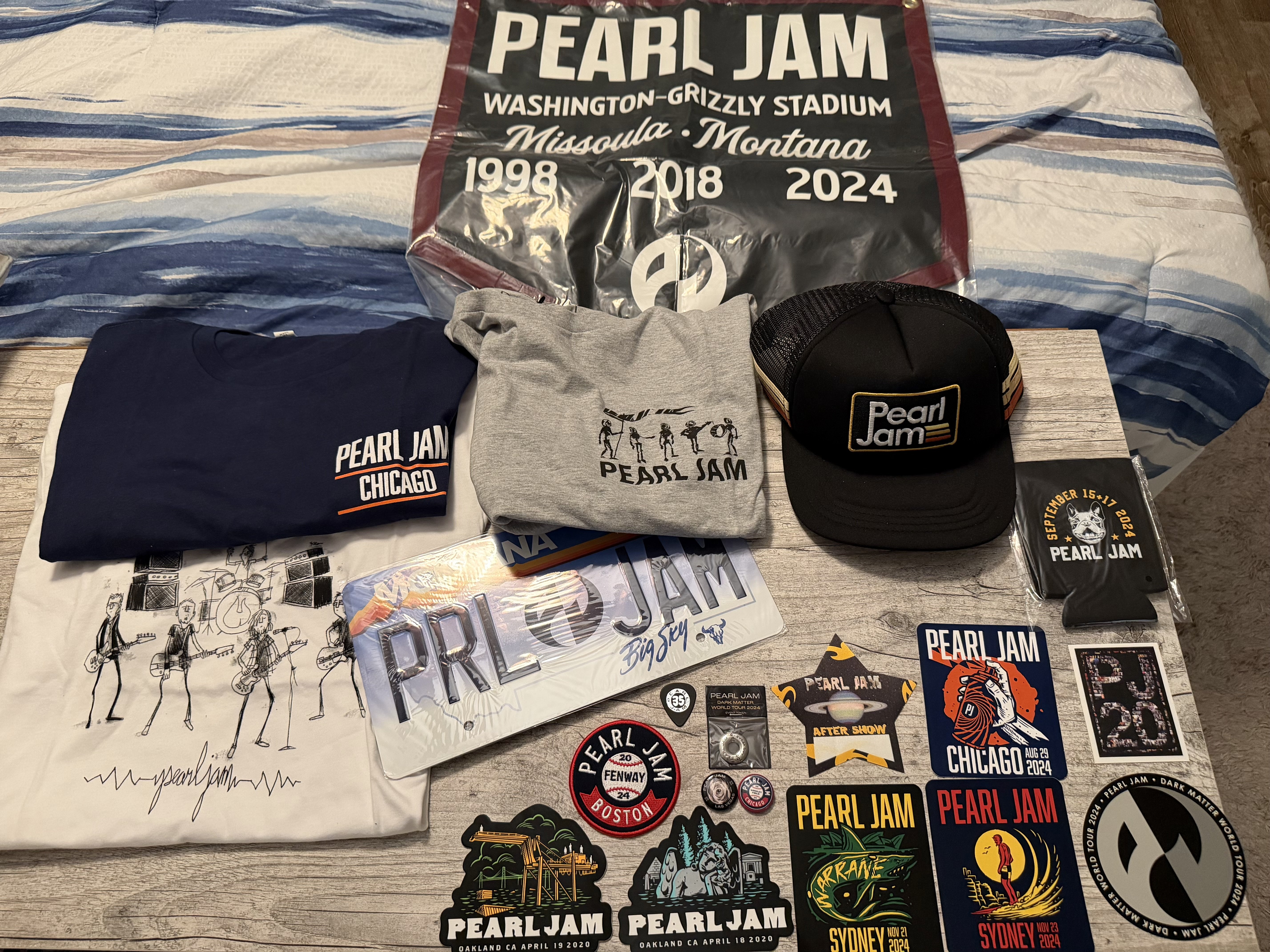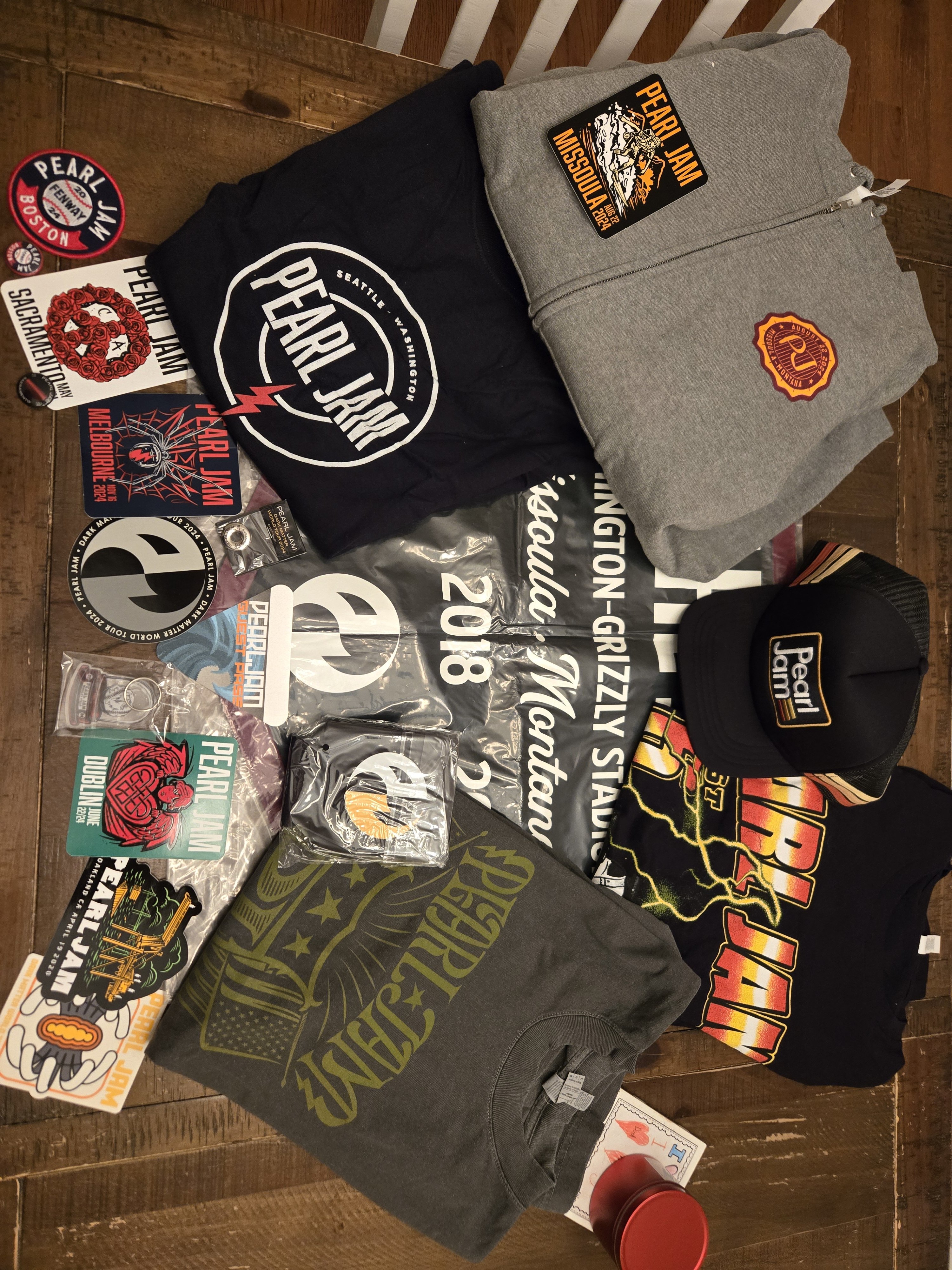 Men's M arrived for me today after the weather delay yesterday. Very happy with the shirts, especially since the one show specific shirt was one that I attended. Passed on the hat multiple times during the tour so happy to have it as it's grown on me. 2024 Chicago and Vegas buttons that I also attended, along with a Vegas token. Sorry if it's already been asked but does anyone have any info on the planet after show sticker?