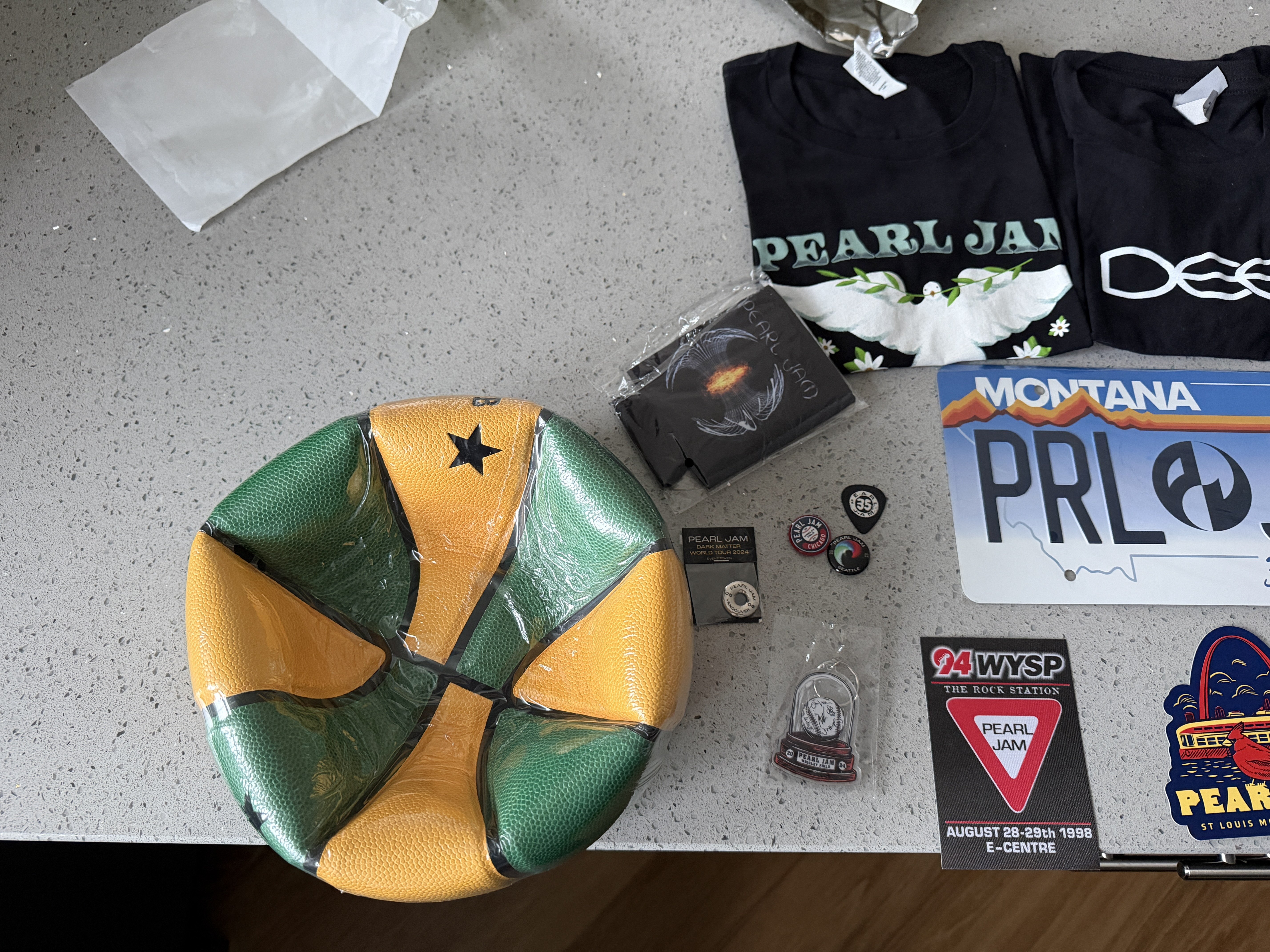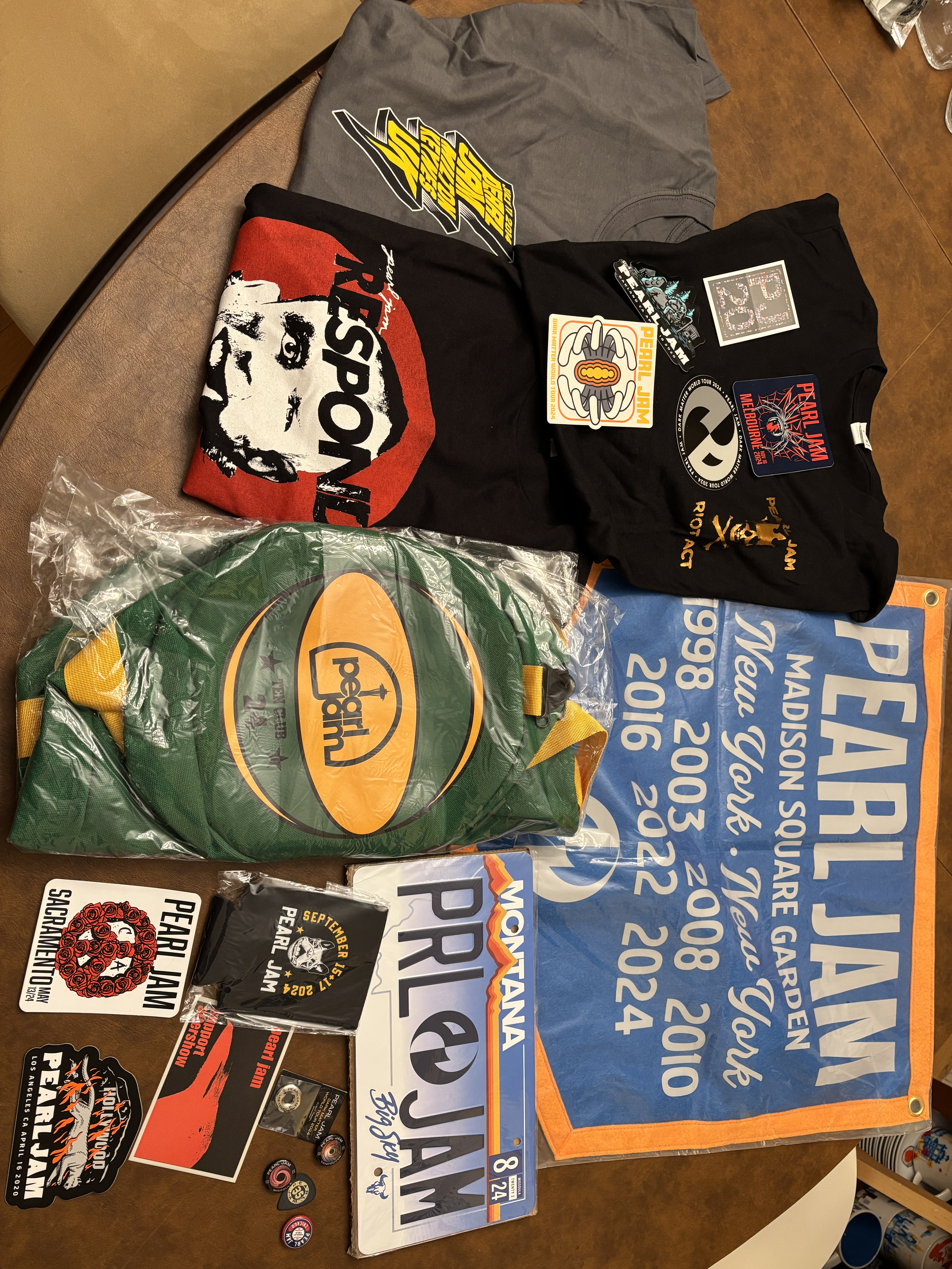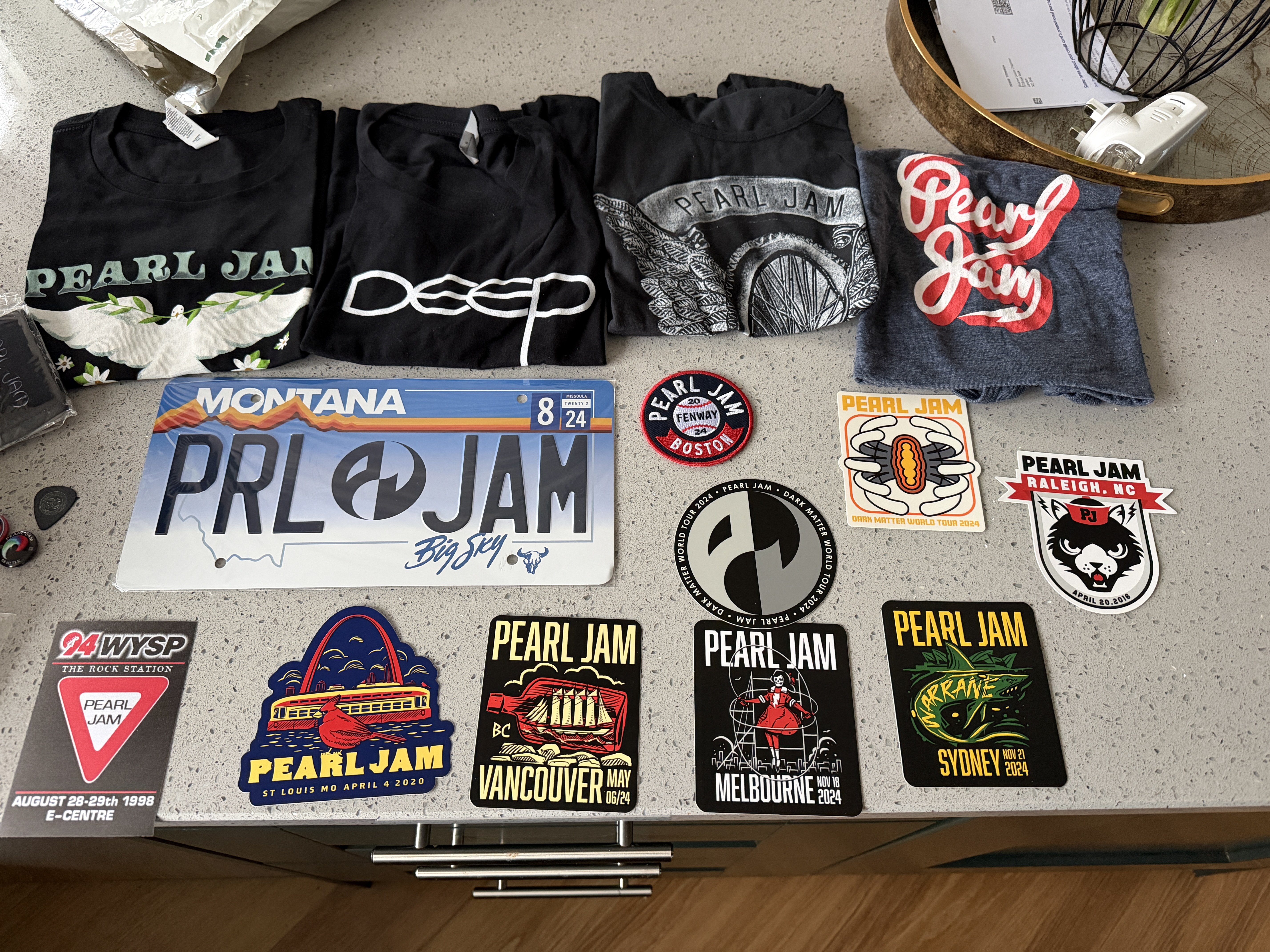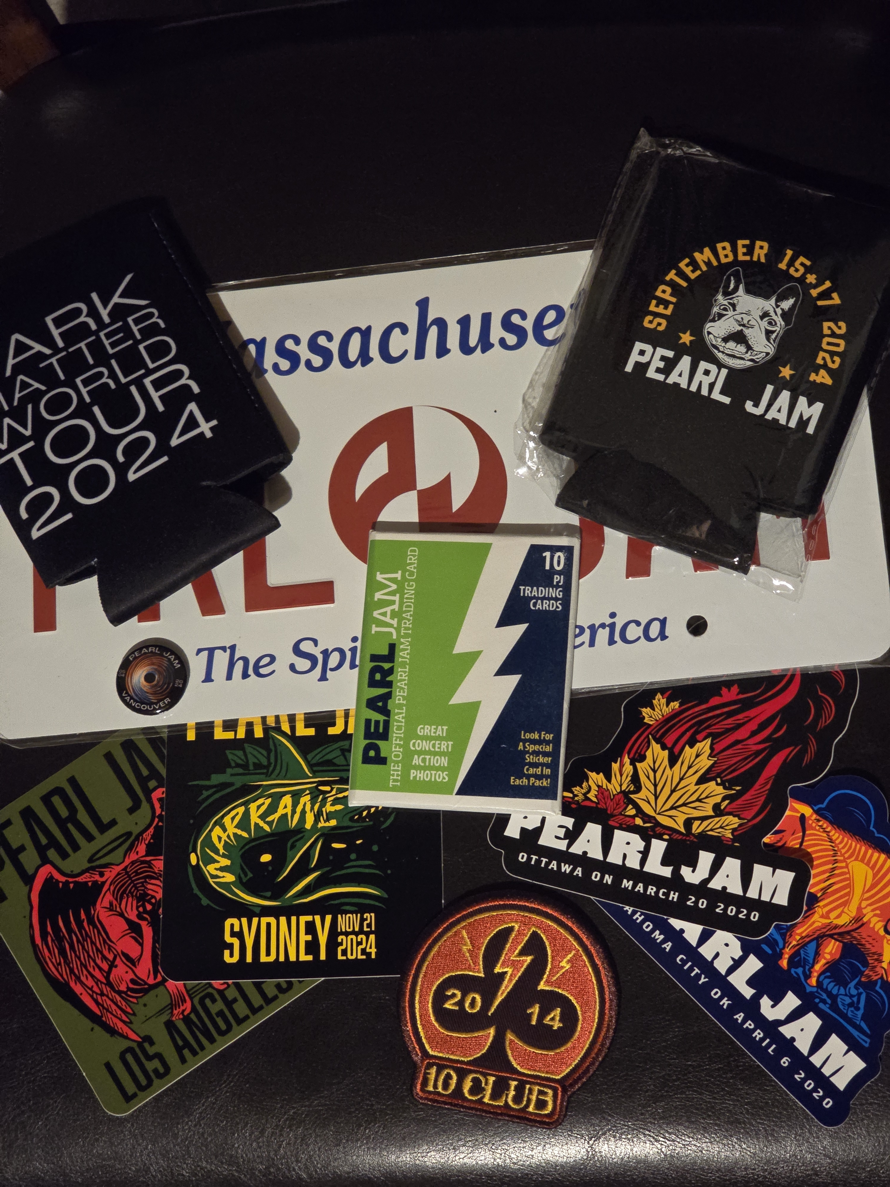 Men's M arrived for me today after the weather delay yesterday. Very happy with the shirts, especially since the one show specific shirt was one that I attended. Passed on the hat multiple times during the tour so happy to have it as it's grown on me. 2024 Chicago and Vegas buttons that I also attended, along with a Vegas token. Sorry if it's already been asked but does anyone have any info on the planet after show sticker?