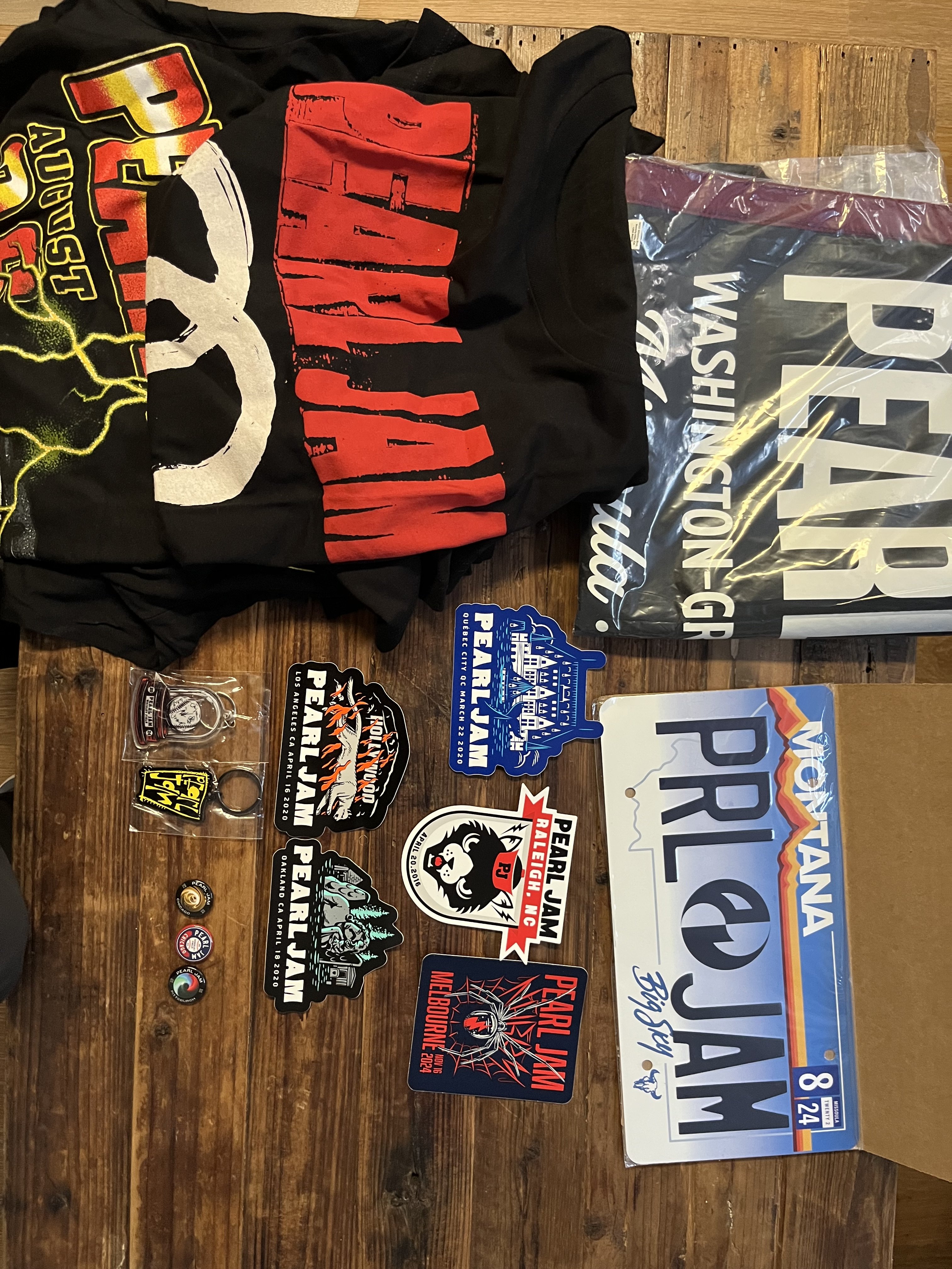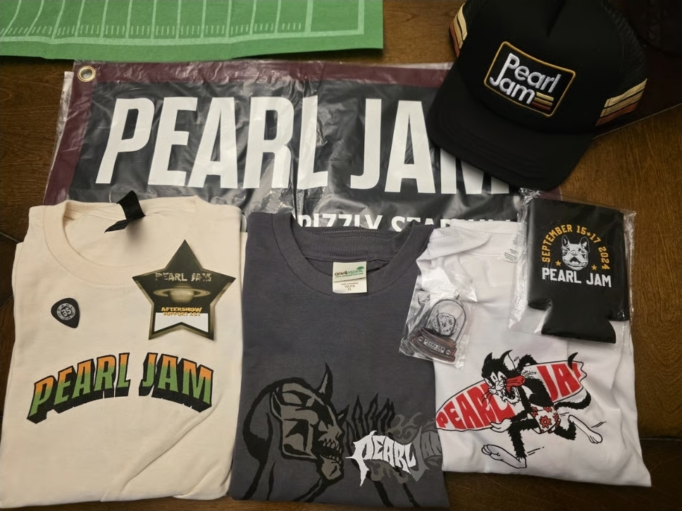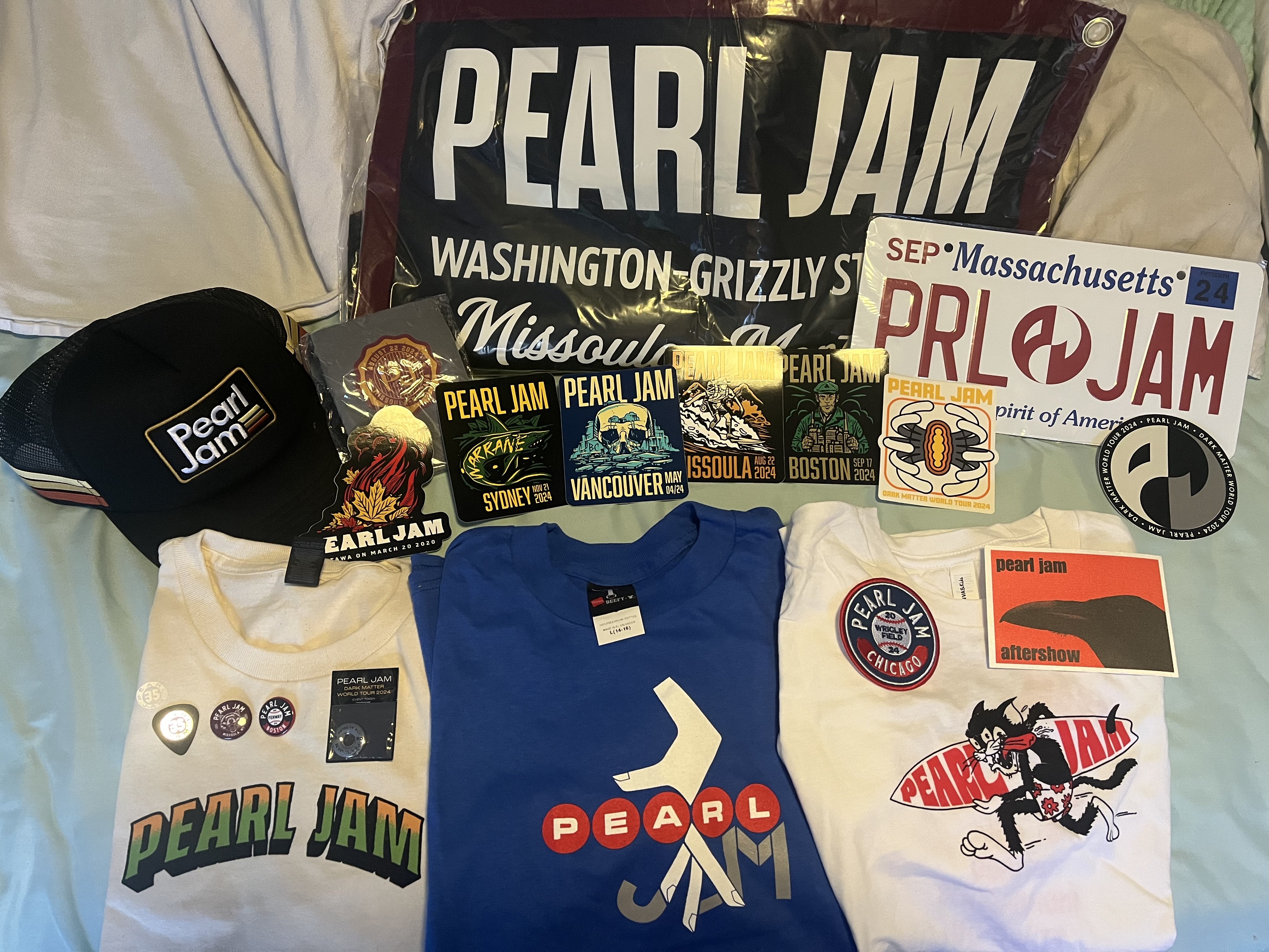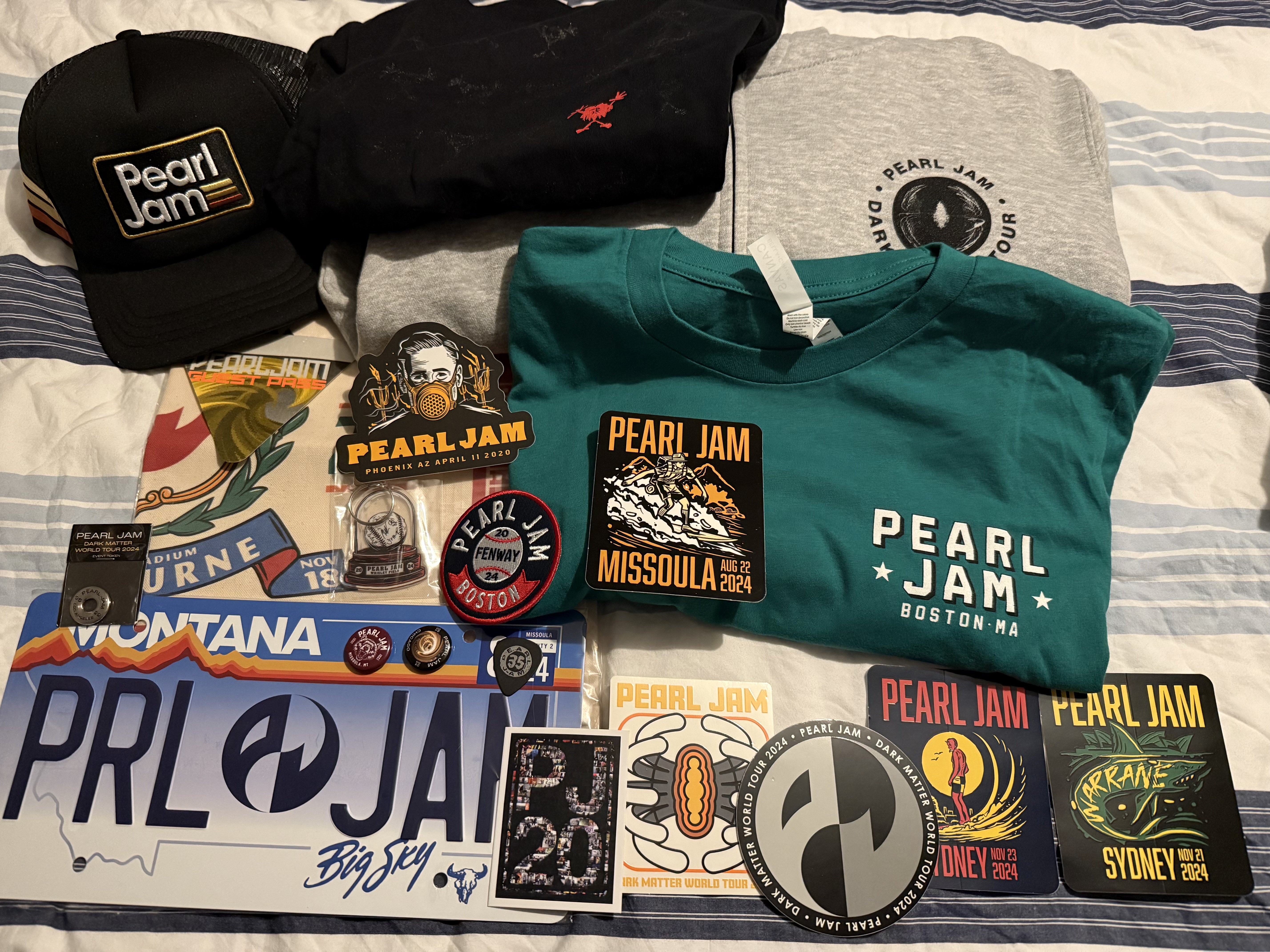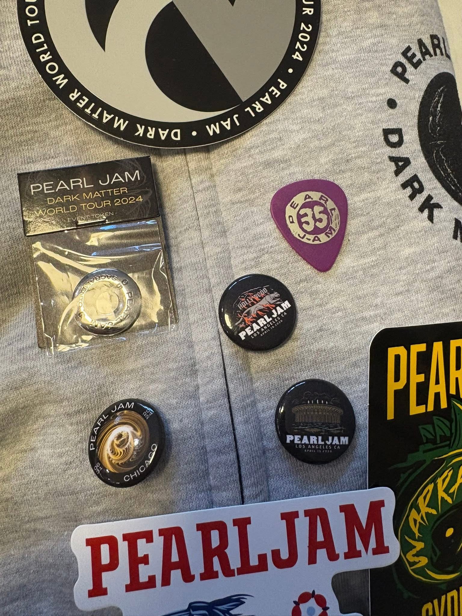 In search of Pitt Night 1 token (long shot), medium shirts: Strangest tribes, Dark Matter Tour hoodies, Fenway banner, Ten club shirts, Ten club patches or the surf/boonie hat.