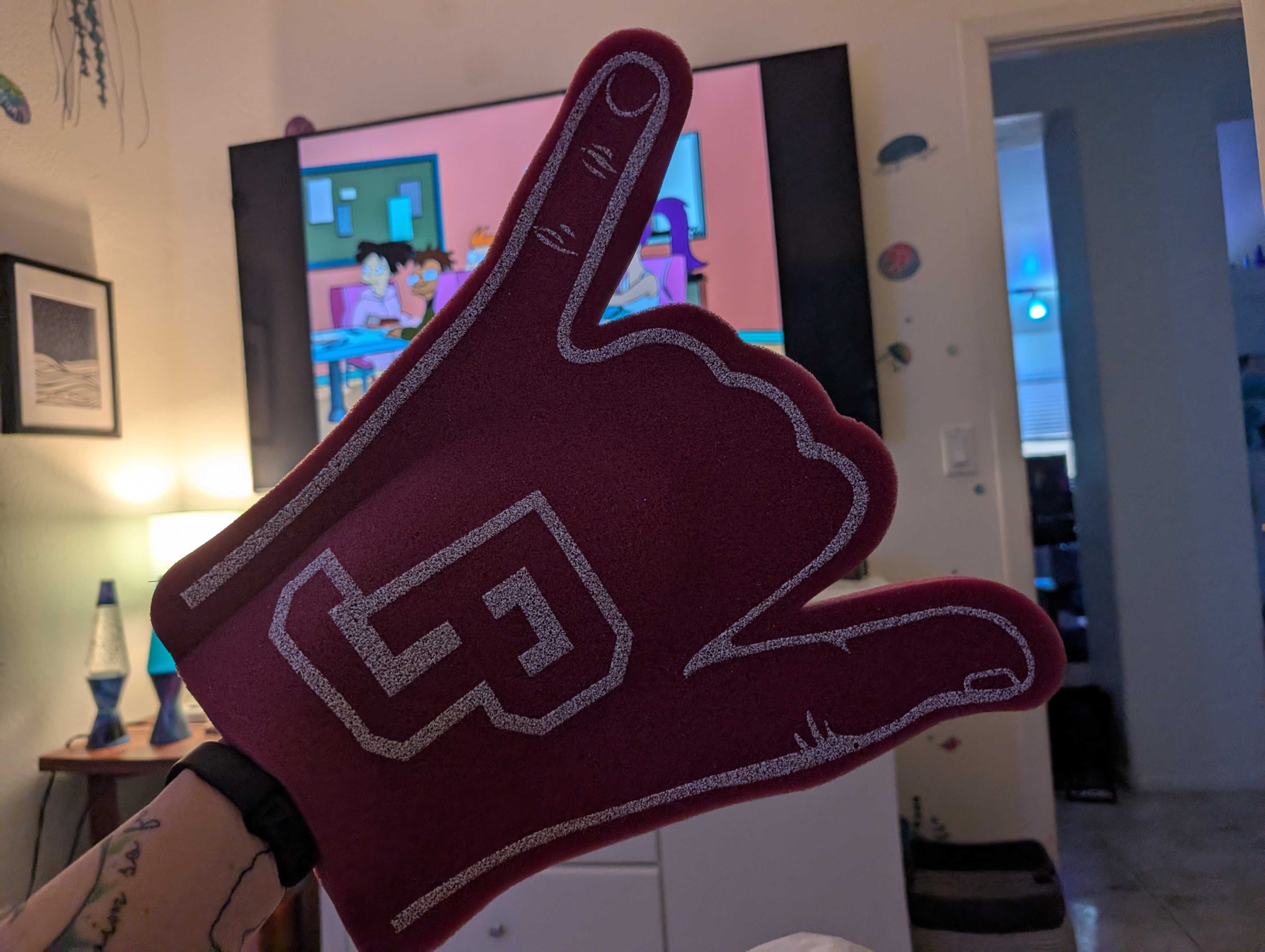 I'm opening it. The first thing I feel is a gigantic foam finger. EXCEPT it's a SHAKA and it's like Santos knows me 🤙🤙🤙🤙🤙🤙
