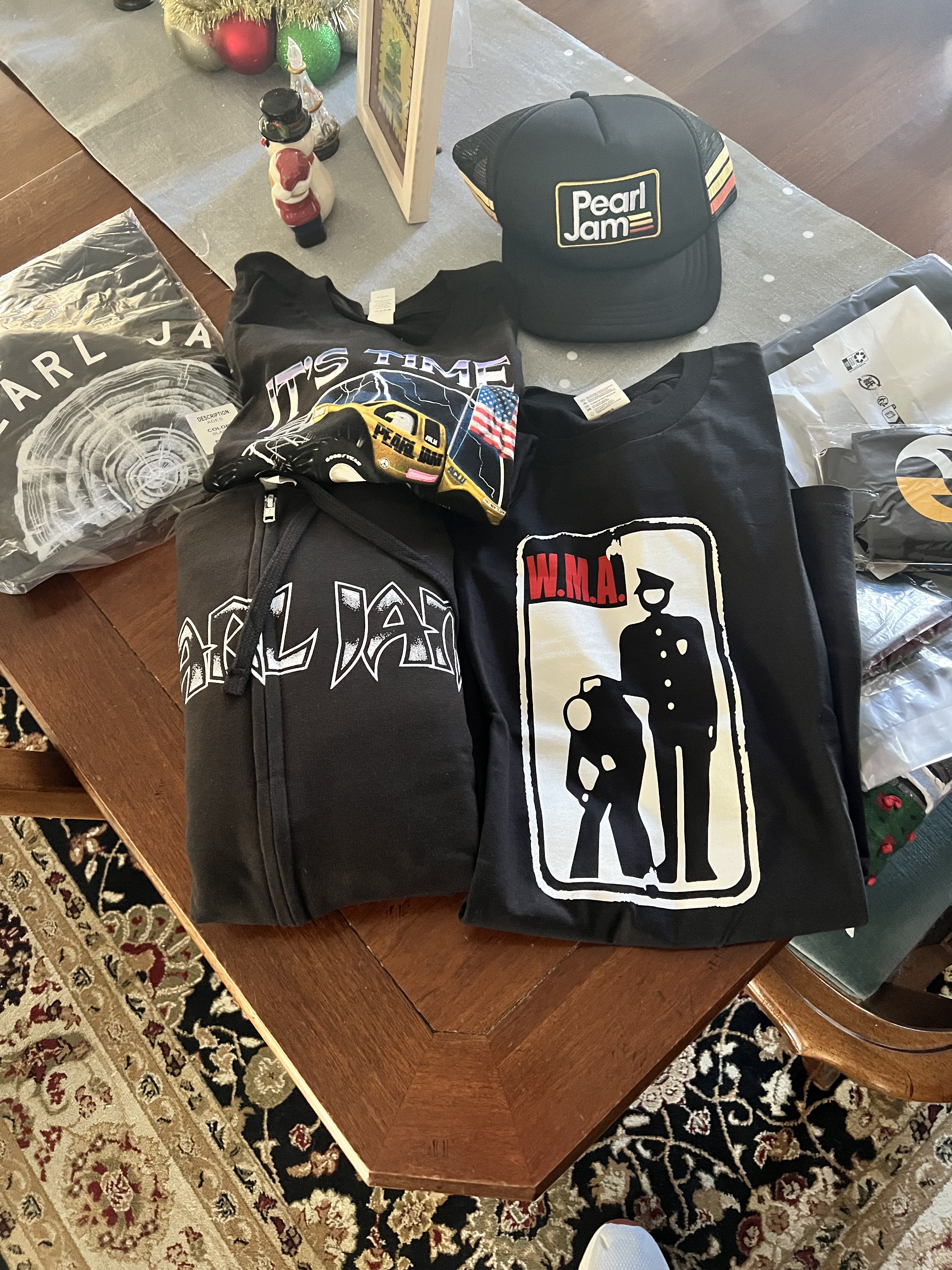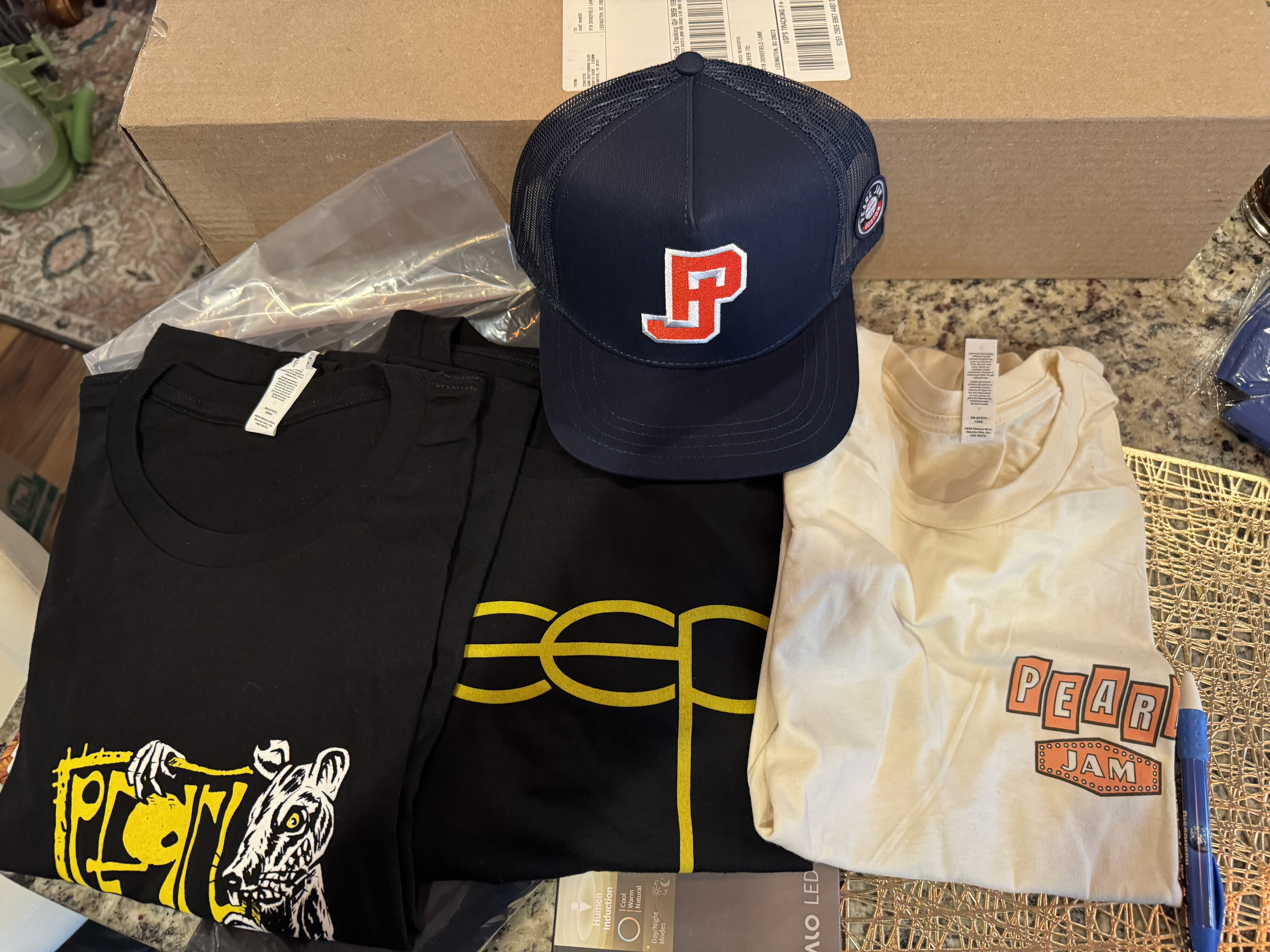 Here is my Men's Small 2.8 pound. Some older stuff in this one. The gray shirt is from Euro 2012.the blue is Stockholm 2014. This year we got another (but different) hoodie, but alas once again my kid's size. Happy to get the cap, which will be a nice partner to my OG Stickman cap (attached). I think I bought this at one of their club shows in Seattle before Ten came out. If not before, pretty soon thereafter.