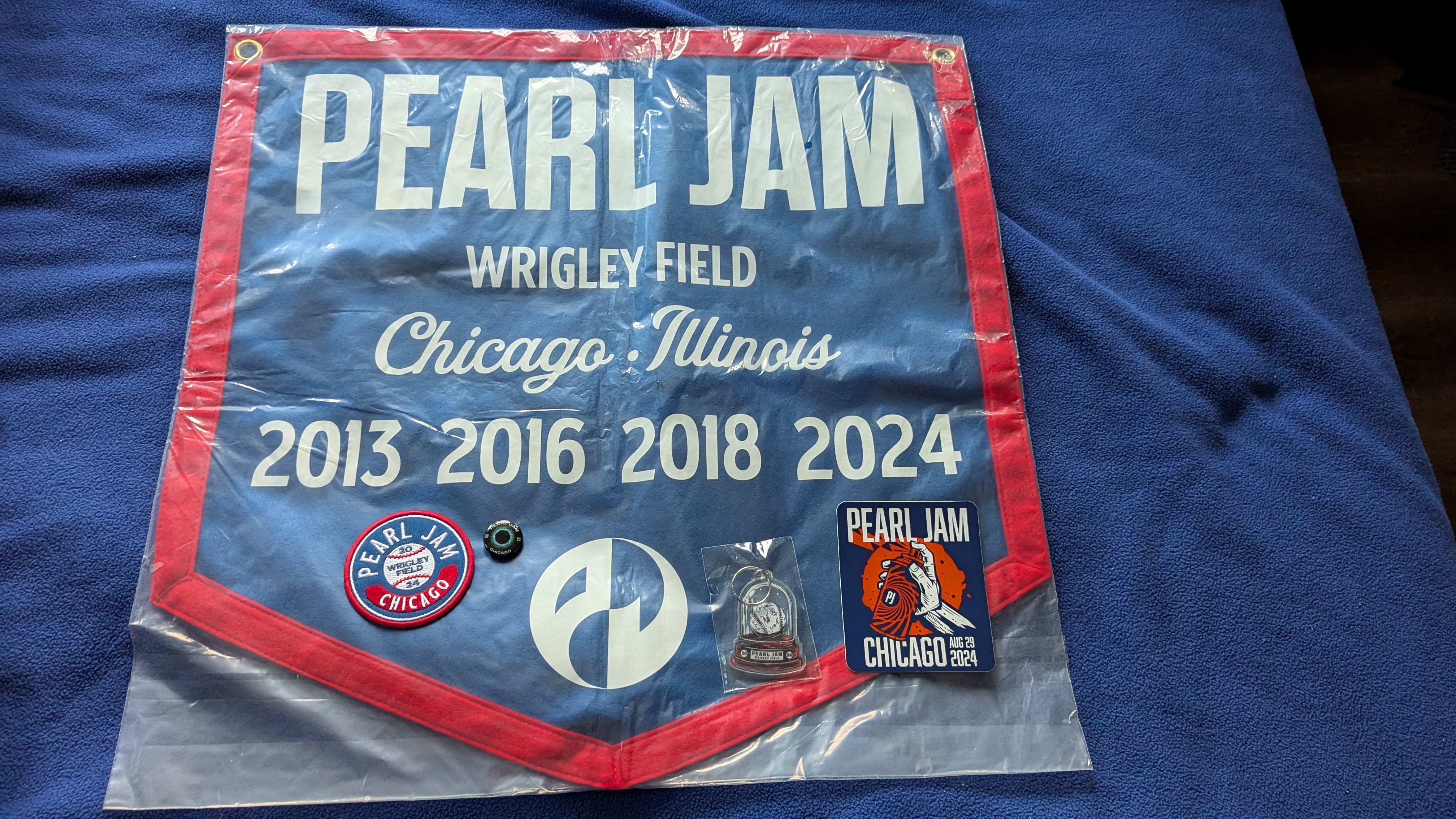 Chicago banner, sticker, pin, patch and keychain on fb pj bay.