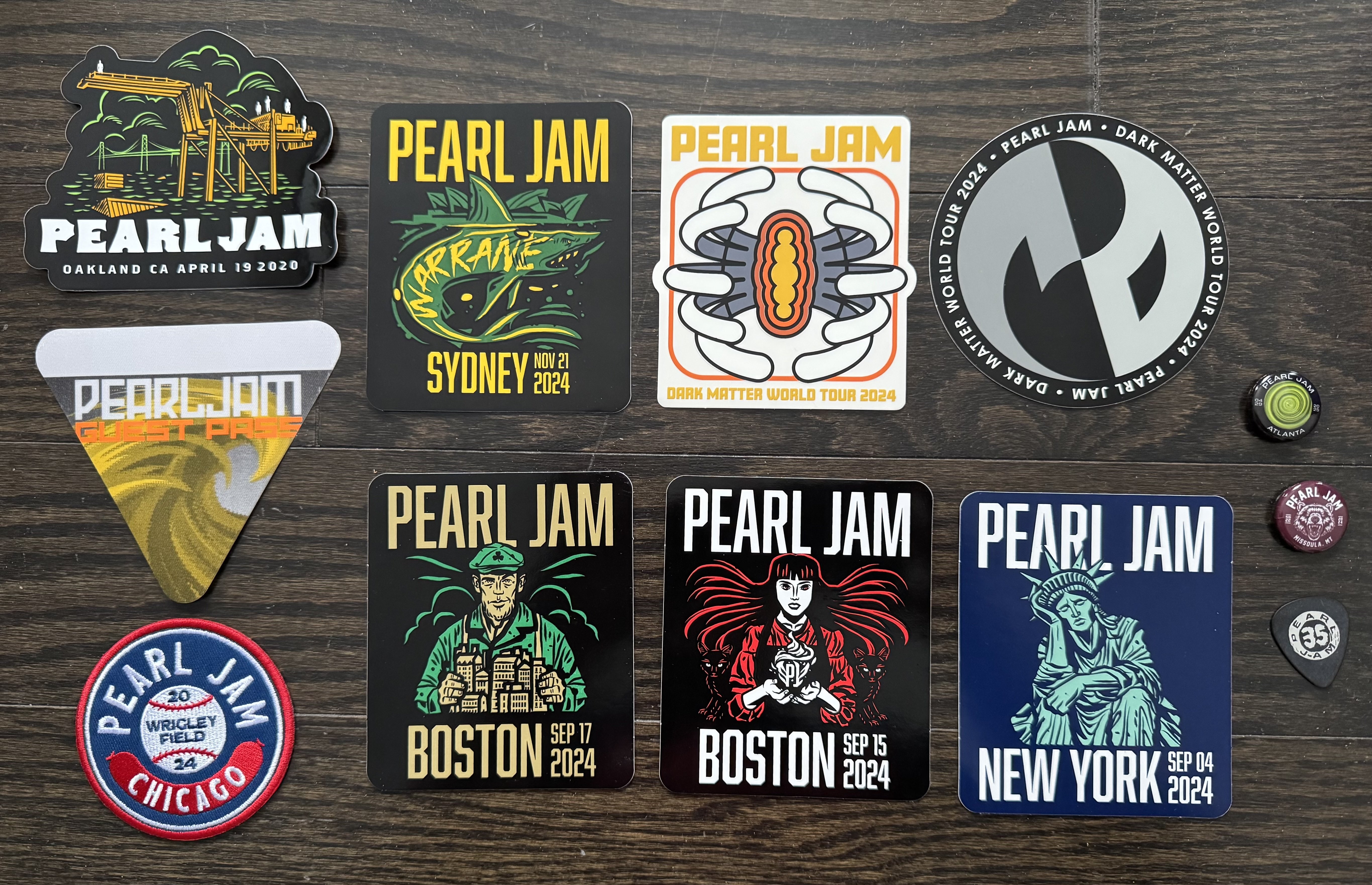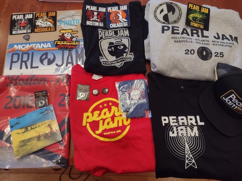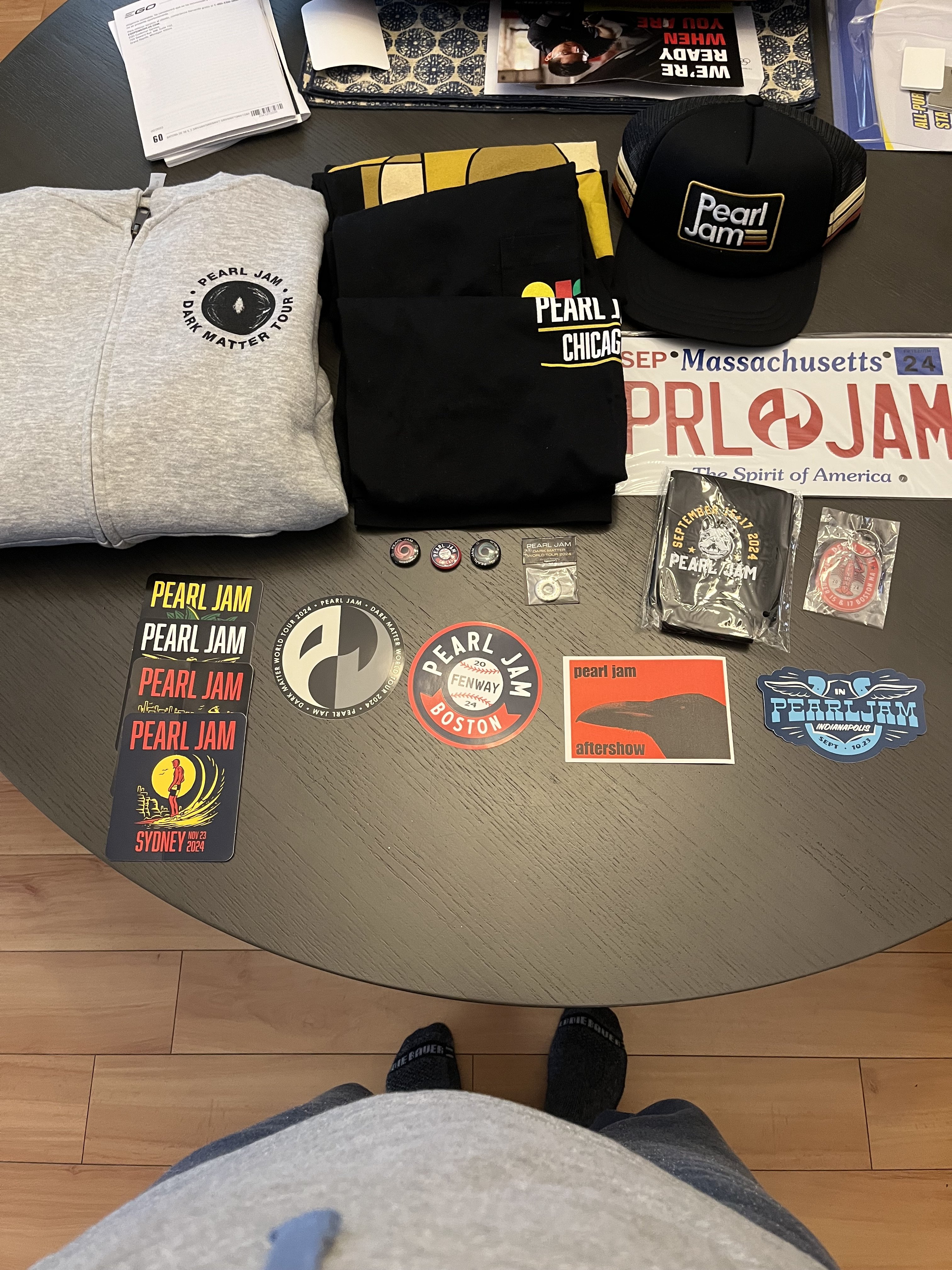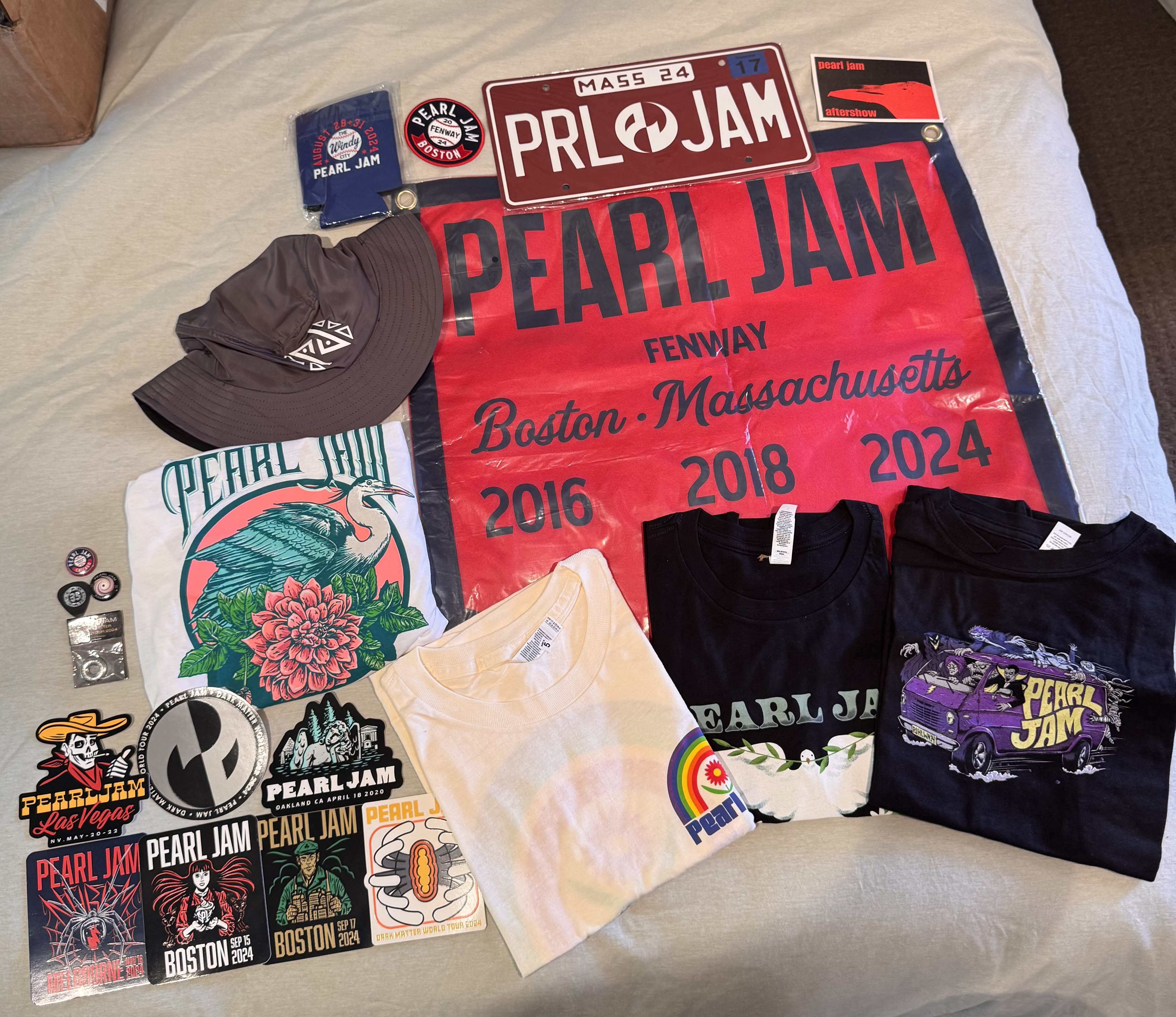 MS, will keep the duffel bag, the sweatshirt (for my daughter), guitar pick, world tour sticker and the Sacto button. the rest will trade/gift: Montana plate, Fenway banner, tokens — L.A. 5/21 and Napa 5/25, Boston 9/17 pin and koozie, not sure what the Photo sticker is from so that’s debatable, Tshirts — Boston 9/17, Europe Tour 2012 and 2008 PJ Tour. DM me, thanks, this was worth the wait, good times and thanks Santos/PJ crew.0 -