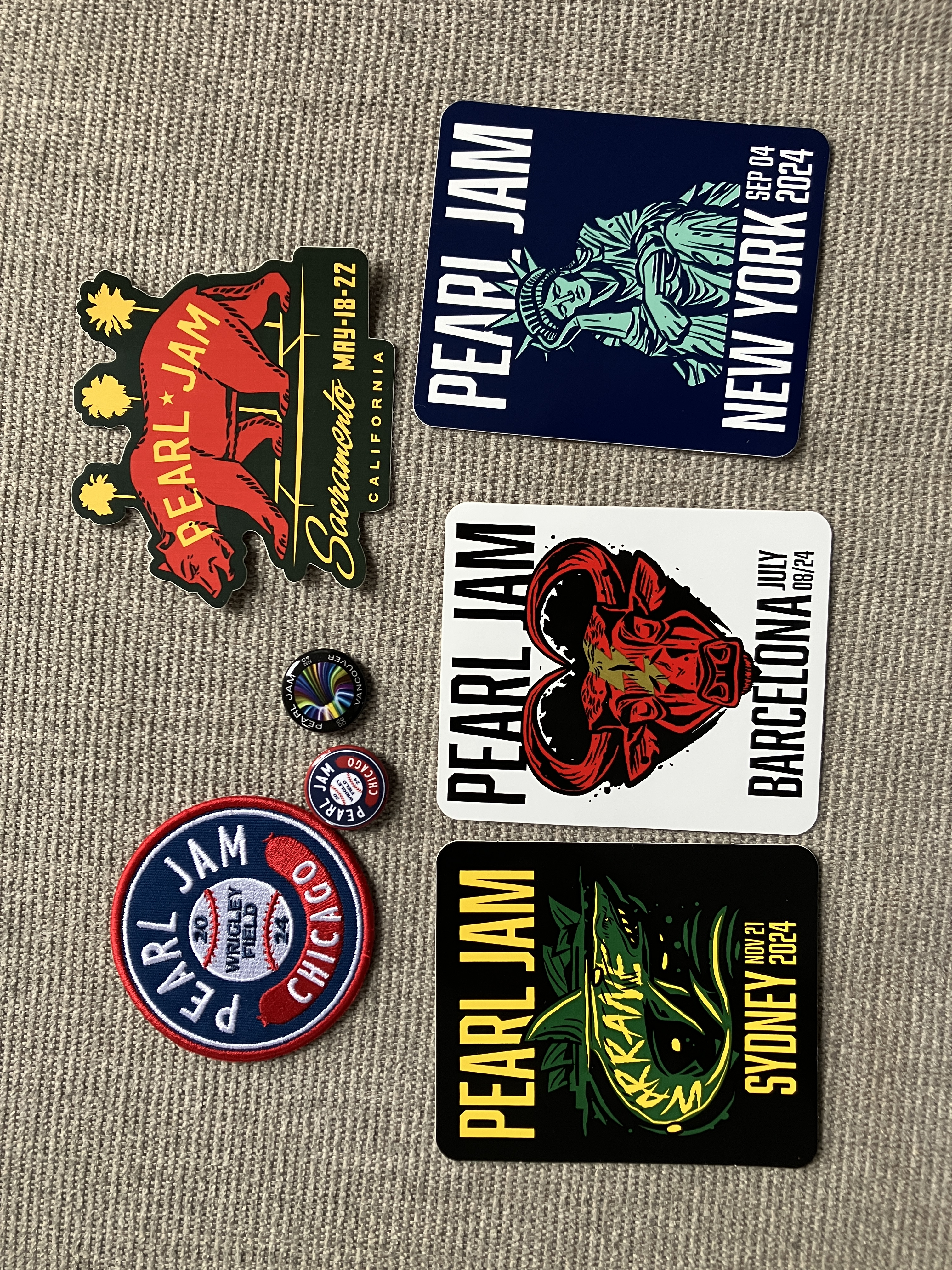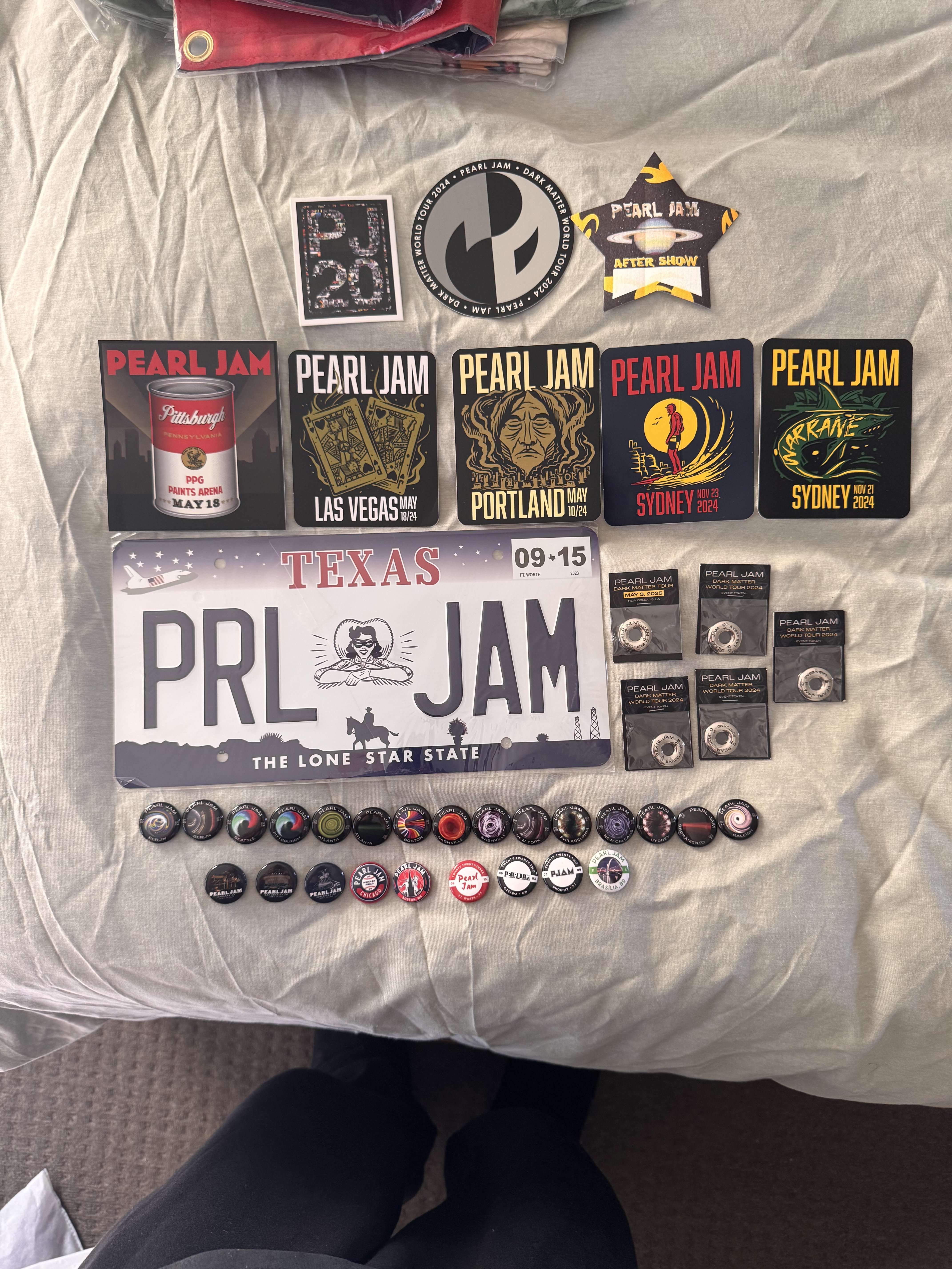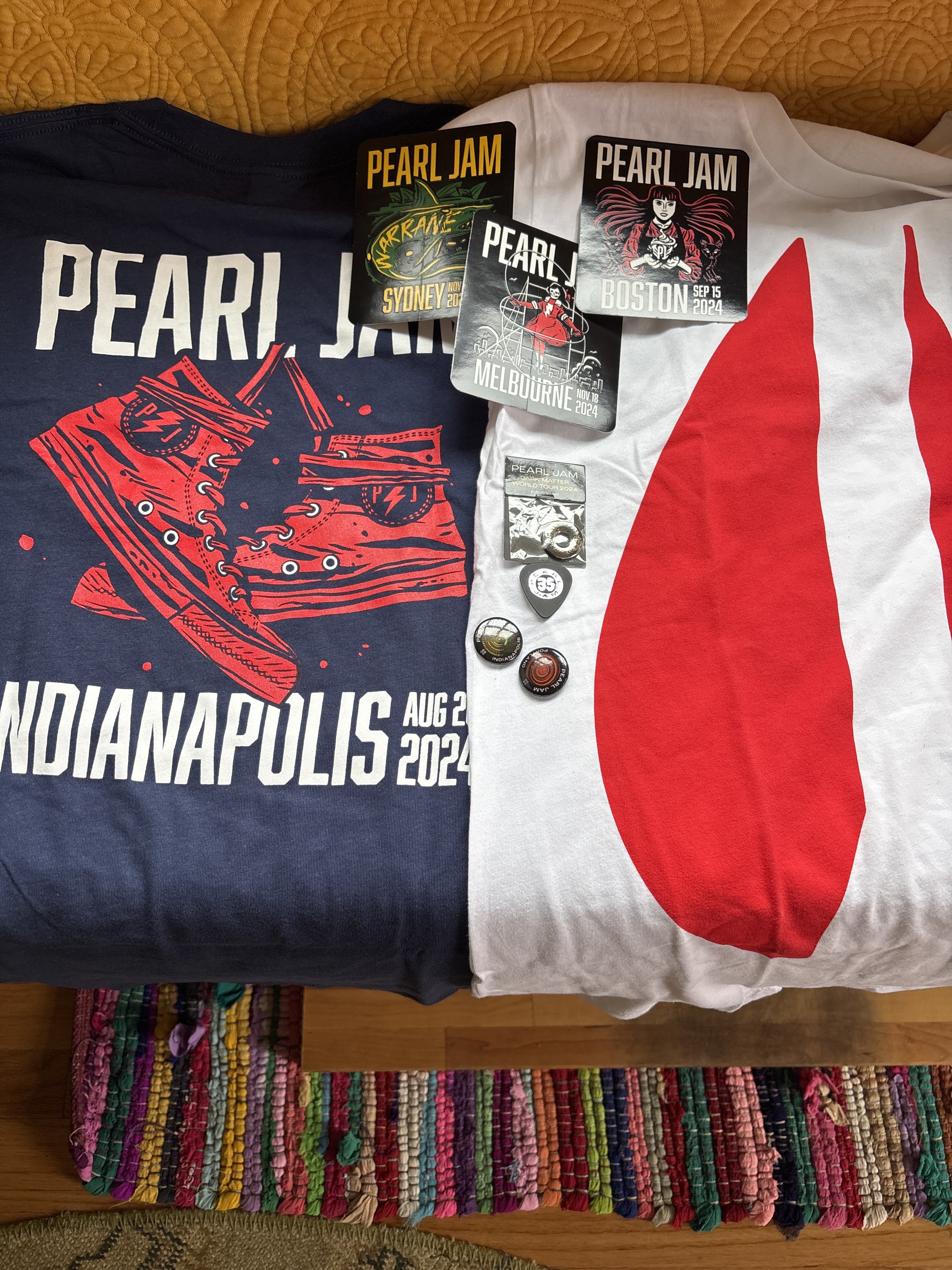 MS, will keep the duffel bag, the sweatshirt (for my daughter), guitar pick, world tour sticker and the Sacto button. the rest will trade/gift: Montana plate, Fenway banner, tokens — L.A. 5/21 and Napa 5/25, Boston 9/17 pin and koozie, not sure what the Photo sticker is from so that’s debatable, Tshirts — Boston 9/17, Europe Tour 2012 and 2008 PJ Tour. DM me, thanks, this was worth the wait, good times and thanks Santos/PJ crew.0 -