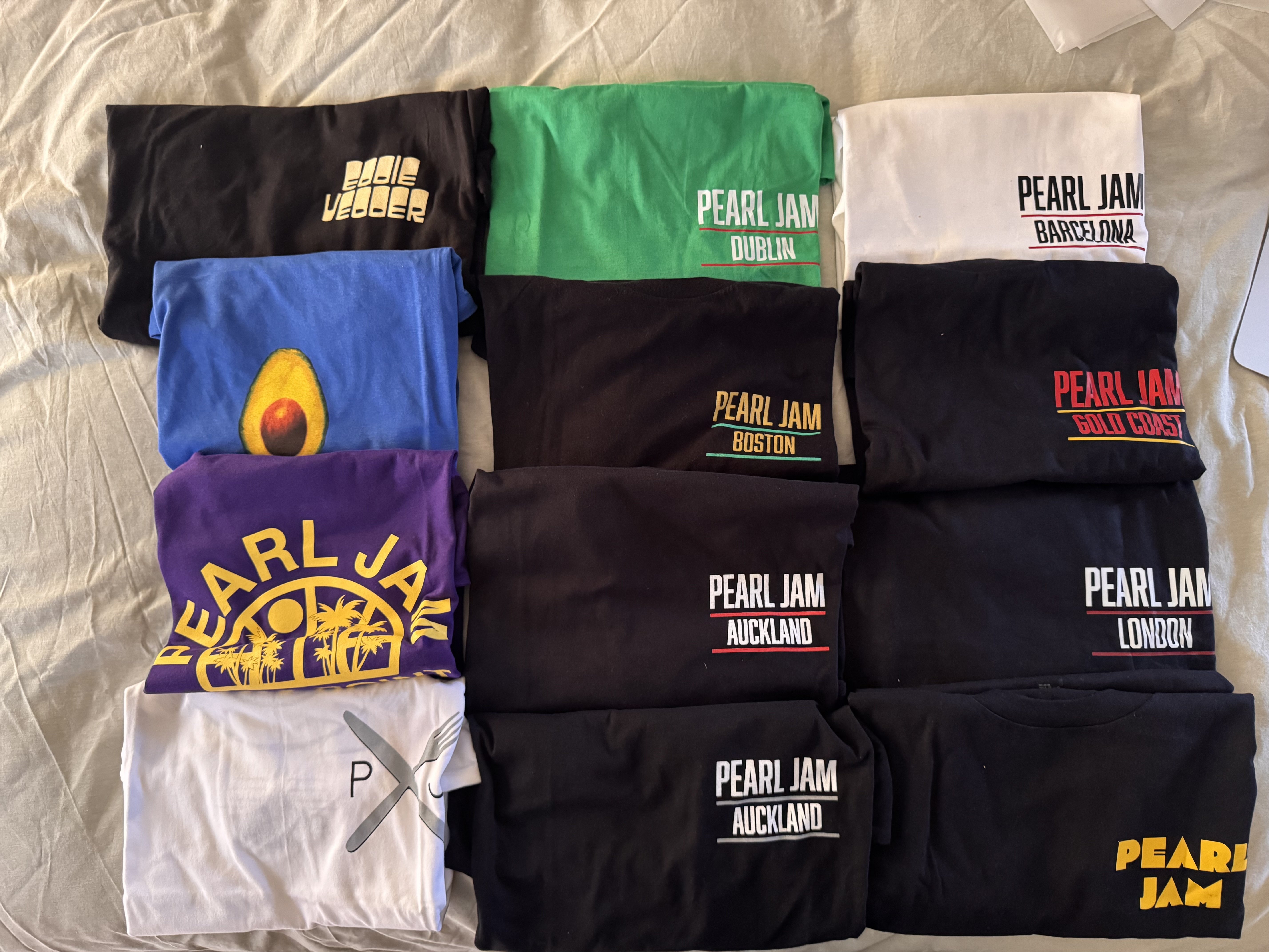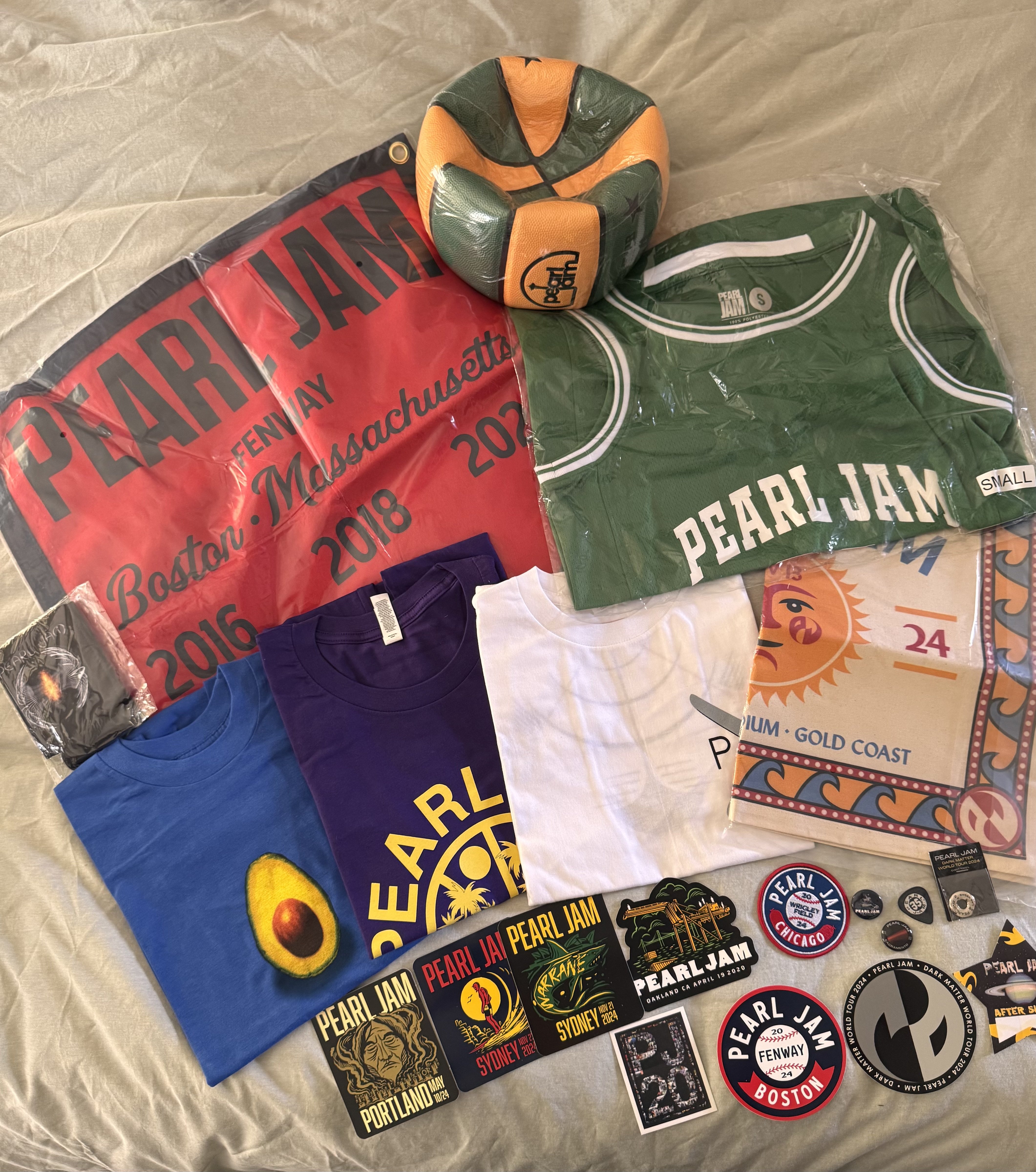 Arrived in Melbourne AustraliaThe difference in my two bags were night and day. This bag is a real winner and a couple of items I will keep. Being a men’s large/XL I’m sad the small tees don’t fit. I’d keep them all just brilliant.Tshirts are small PJ (never give up) knife and fork design, PJ Avo 2006 tour tshirt and PJ Ohana Festival 2021 purple tour tshirt.Gold Coast tea towel for trade of a Melbourne or Sydney one please. I’m happy to keep the Fenway Banner but happy to trade or sell. I already have the Boston Basketball Jersey in a large so happy to trade/sell this small jersey for good offers. It’s awesome.Trade or sell the pins/tokens/ backstage pass/ number plate and extra tshirts. Best suited to someone in Australia/NZKeeping basketball and stubby holder. Open to all offers0 -