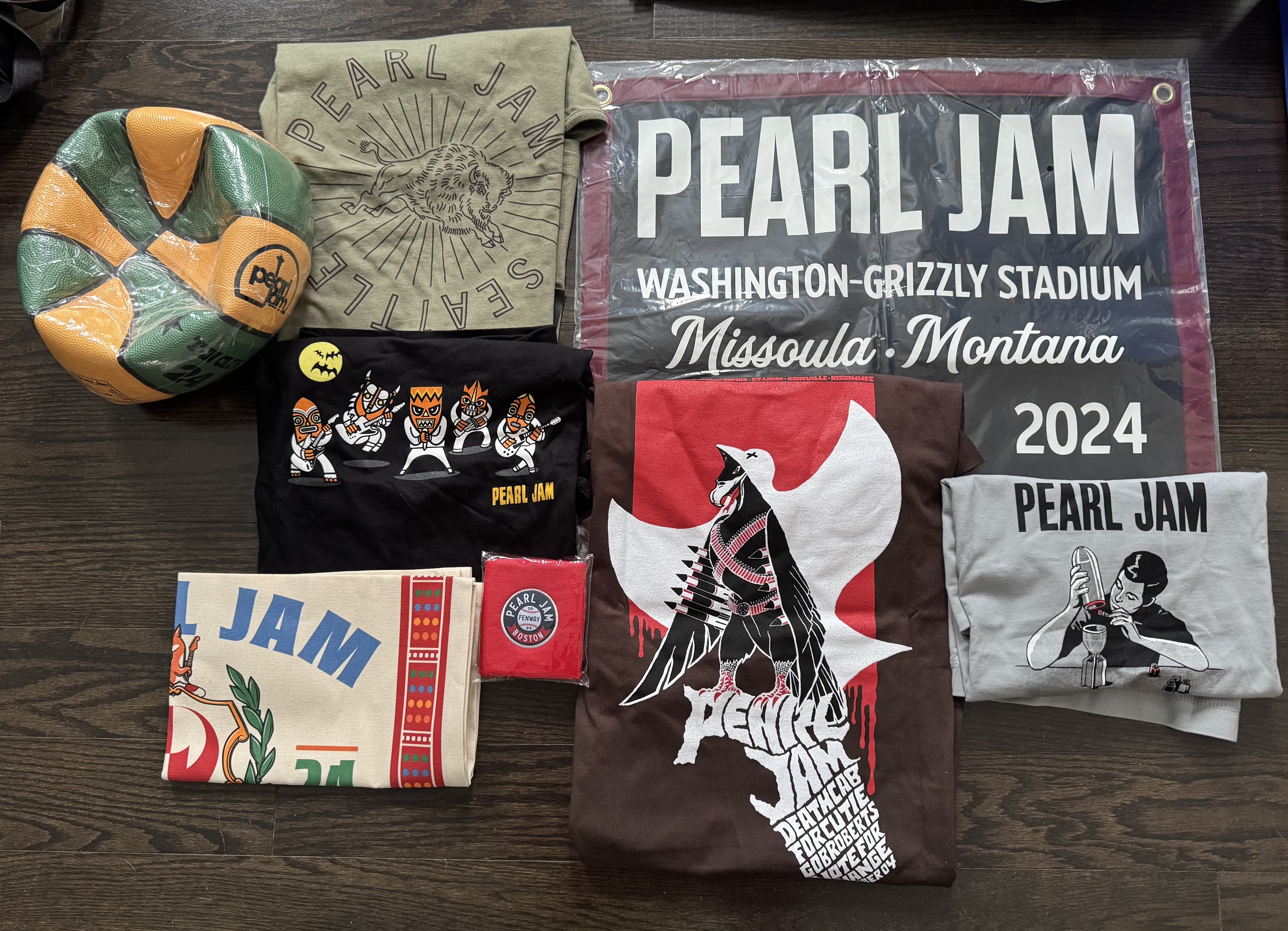 Great Hip shirt.SS188351 said:I don't post very much but it's been so fun seeing everyone's stuff so eff it- I'm joining in.Men's small because I don't usually like the women's cut of stuff. I already have the basketball so will inflate and donate (unless anyone here wants it) but everything else is *chefs kiss*.I'm from the "other" Sydney (on Cape Breton Island, Nova Scotia) so it's fun to think of this as the sticker from the PJ show at Centre 200 🤣 (which, fellas, if you're reading this and looking for new territory to explore- the 6500 capacity crowd would go absolutely apeshit I promise you).Super pumped for the Halloween shirt! I have the zombie one from a hundred years ago and it's getting very worn and the left shoulder is peppered with tiny holes due to a nibbly guinea pig. It will be happy to finally be able to retire. It also reminds me of my Tragically Hip one pictured. Great (design) minds think alike.Thank you Santos and 10C!! 💚💛