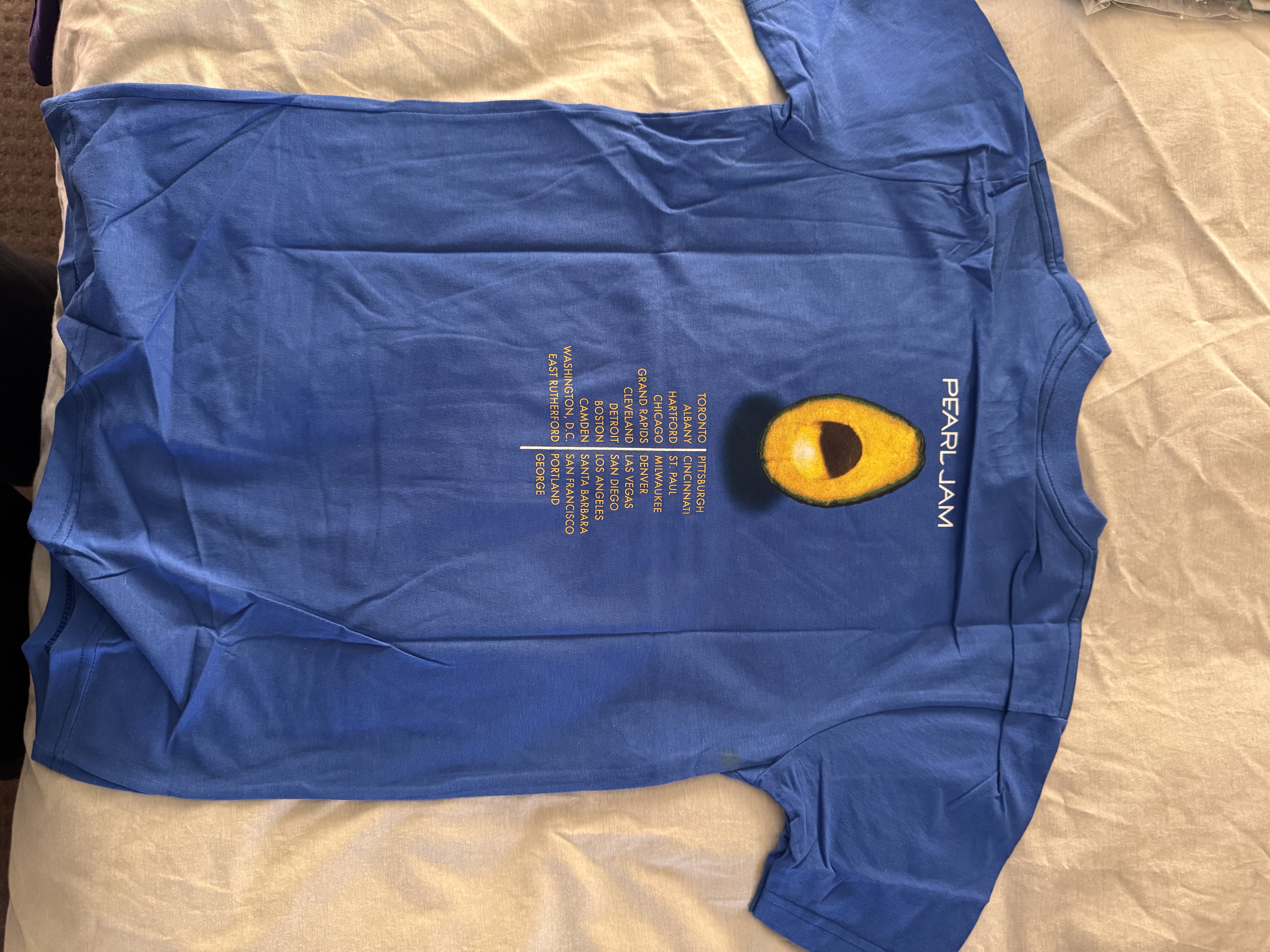 I don't post very much but it's been so fun seeing everyone's stuff so eff it- I'm joining in.Men's small because I don't usually like the women's cut of stuff. I already have the basketball so will inflate and donate (unless anyone here wants it) but everything else is *chefs kiss*.I'm from the "other" Sydney (on Cape Breton Island, Nova Scotia) so it's fun to think of this as the sticker from the PJ show at Centre 200 🤣 (which, fellas, if you're reading this and looking for new territory to explore- the 6500 capacity crowd would go absolutely apeshit I promise you).Super pumped for the Halloween shirt! I have the zombie one from a hundred years ago and it's getting very worn and the left shoulder is peppered with tiny holes due to a nibbly guinea pig. It will be happy to finally be able to retire. It also reminds me of my Tragically Hip one pictured. Great (design) minds think alike.Thank you Santos and 10C!! 💚💛