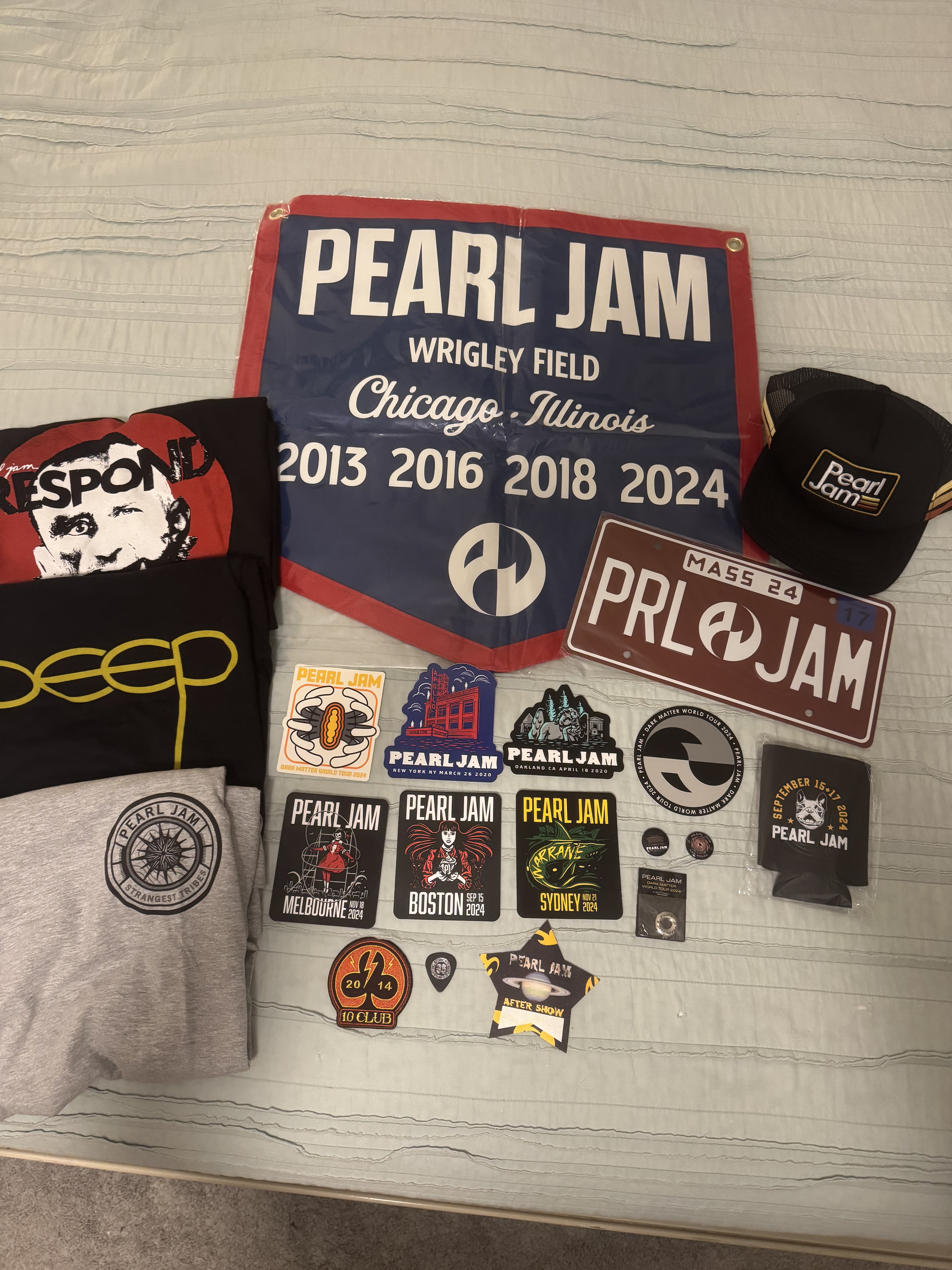 Fenway flag, and the slew of 2024 tour stickers with Philly, Fenway and Melbourne. Also a Fenway keychain, Sydney/Wrigley buttons and Sacramento tokens!