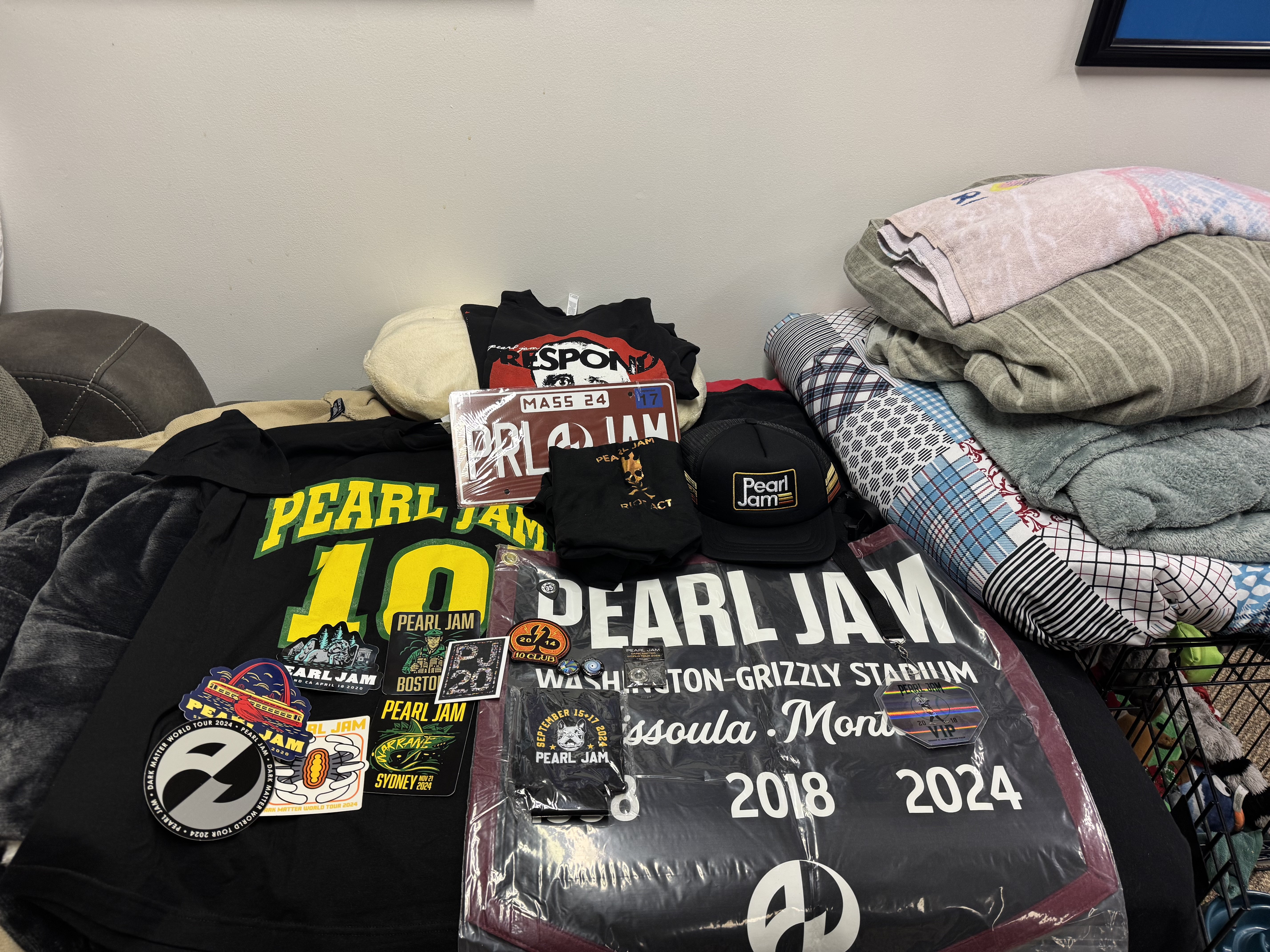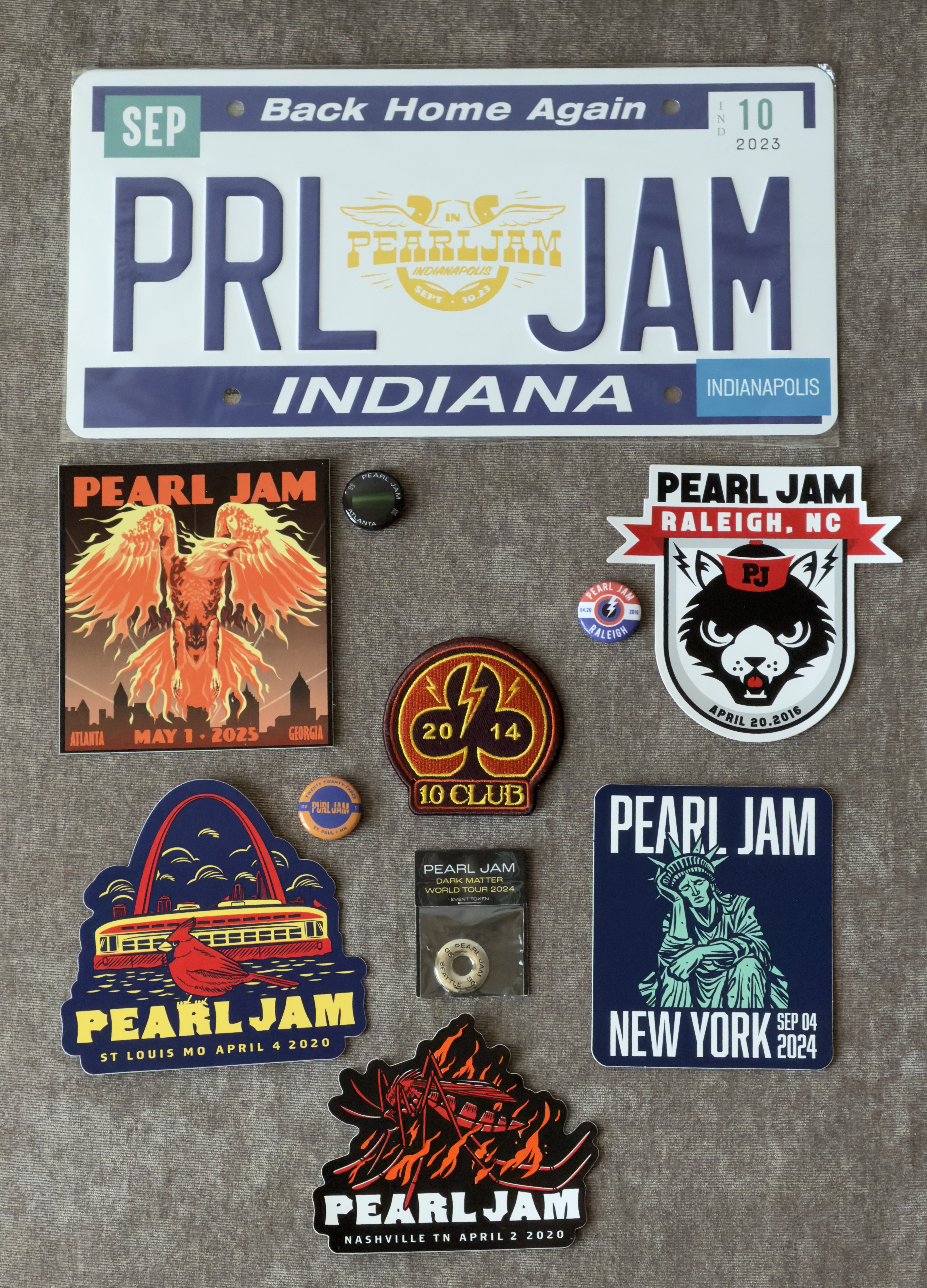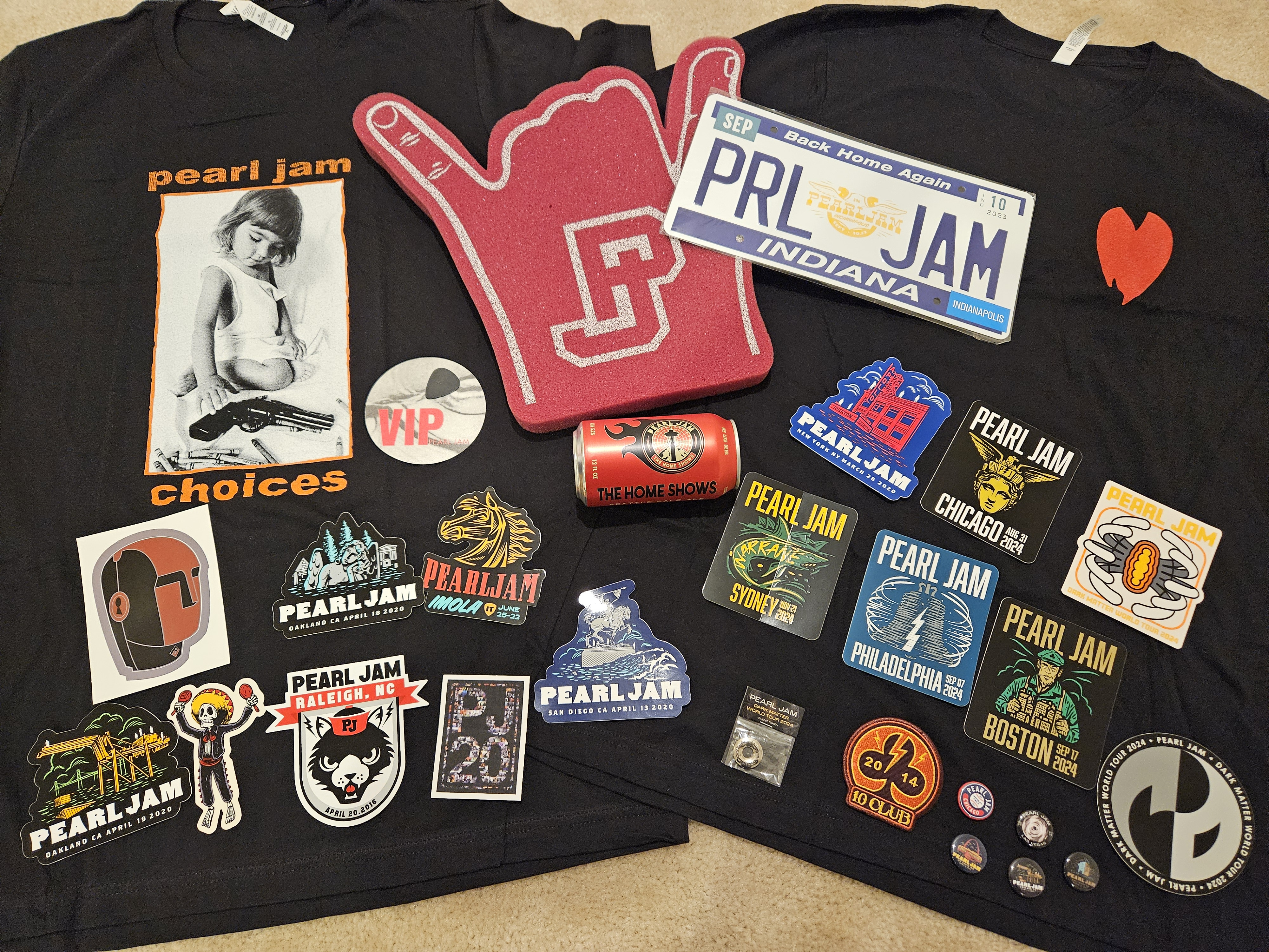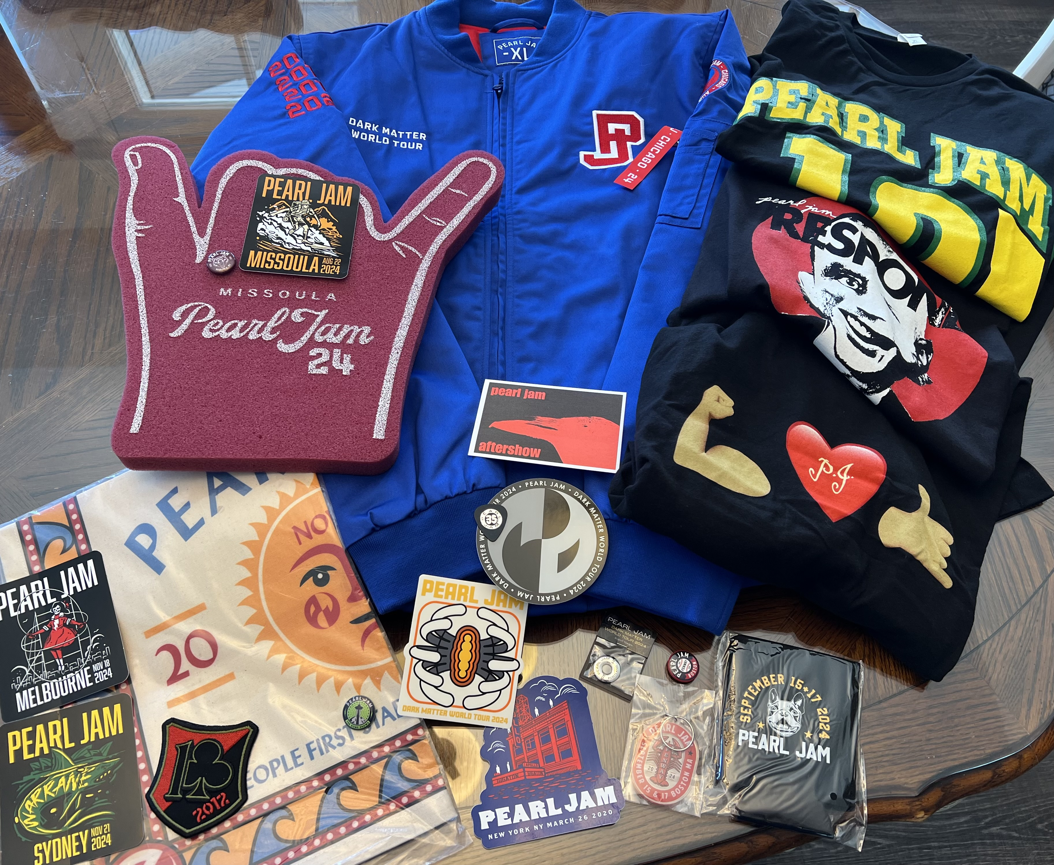 XL bag. Bomber jacket is a pretty sweet score! Everything is available with the exception of the two 2024 Dark Matter tour stickers in the middle and the Jeff pick. Already mailed out and gifted a Dublin sticker to @deb1211.Token is from Portland.