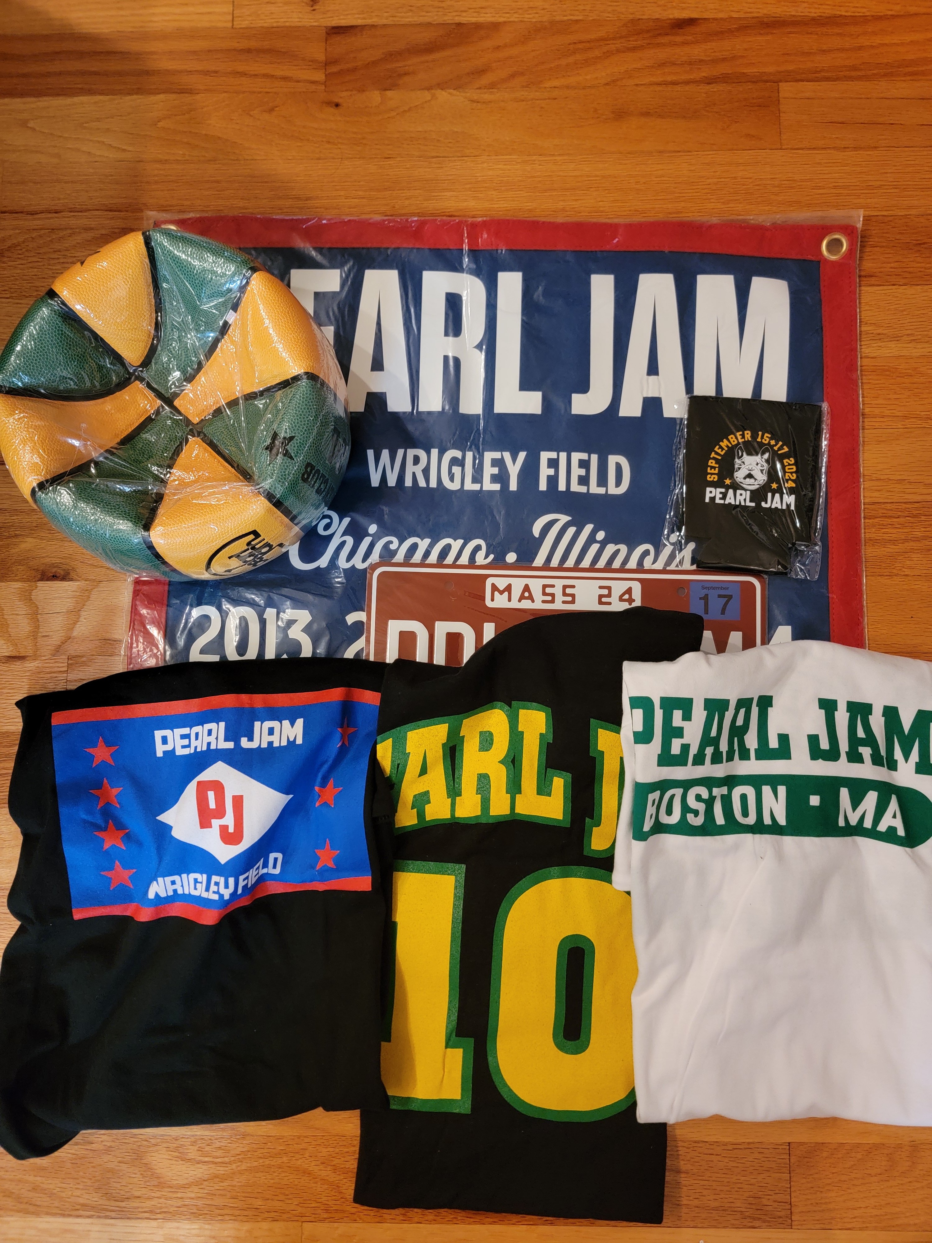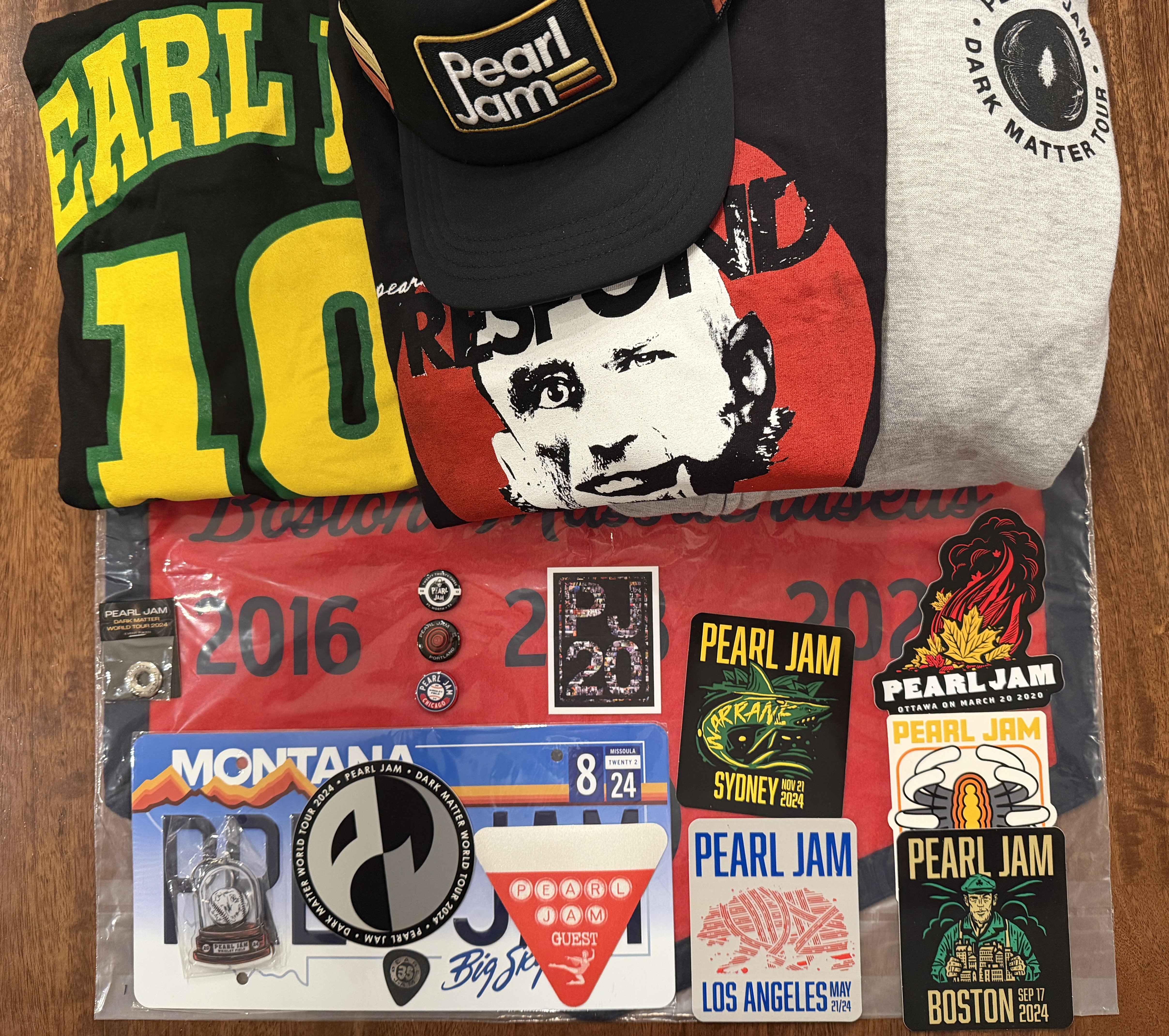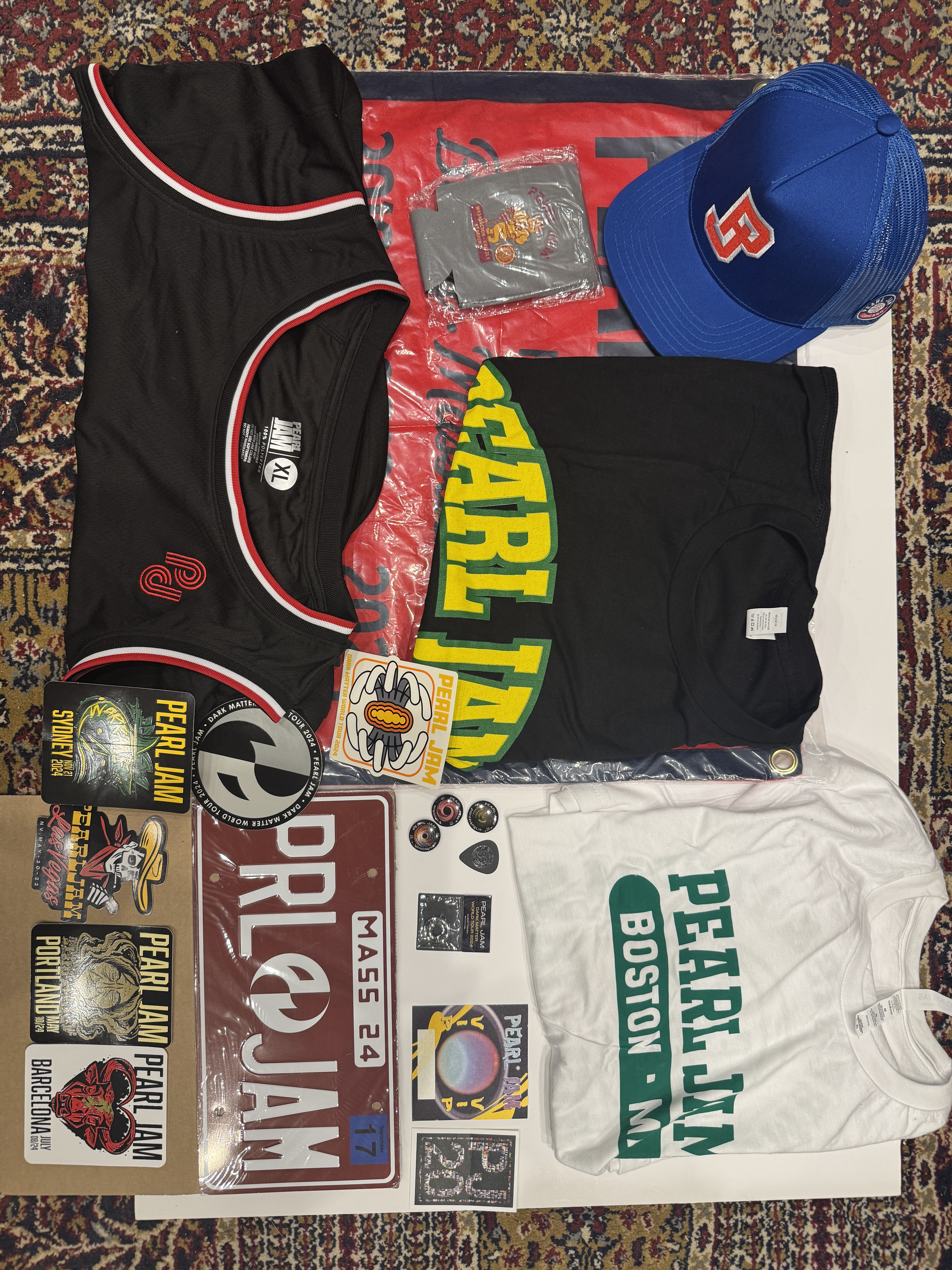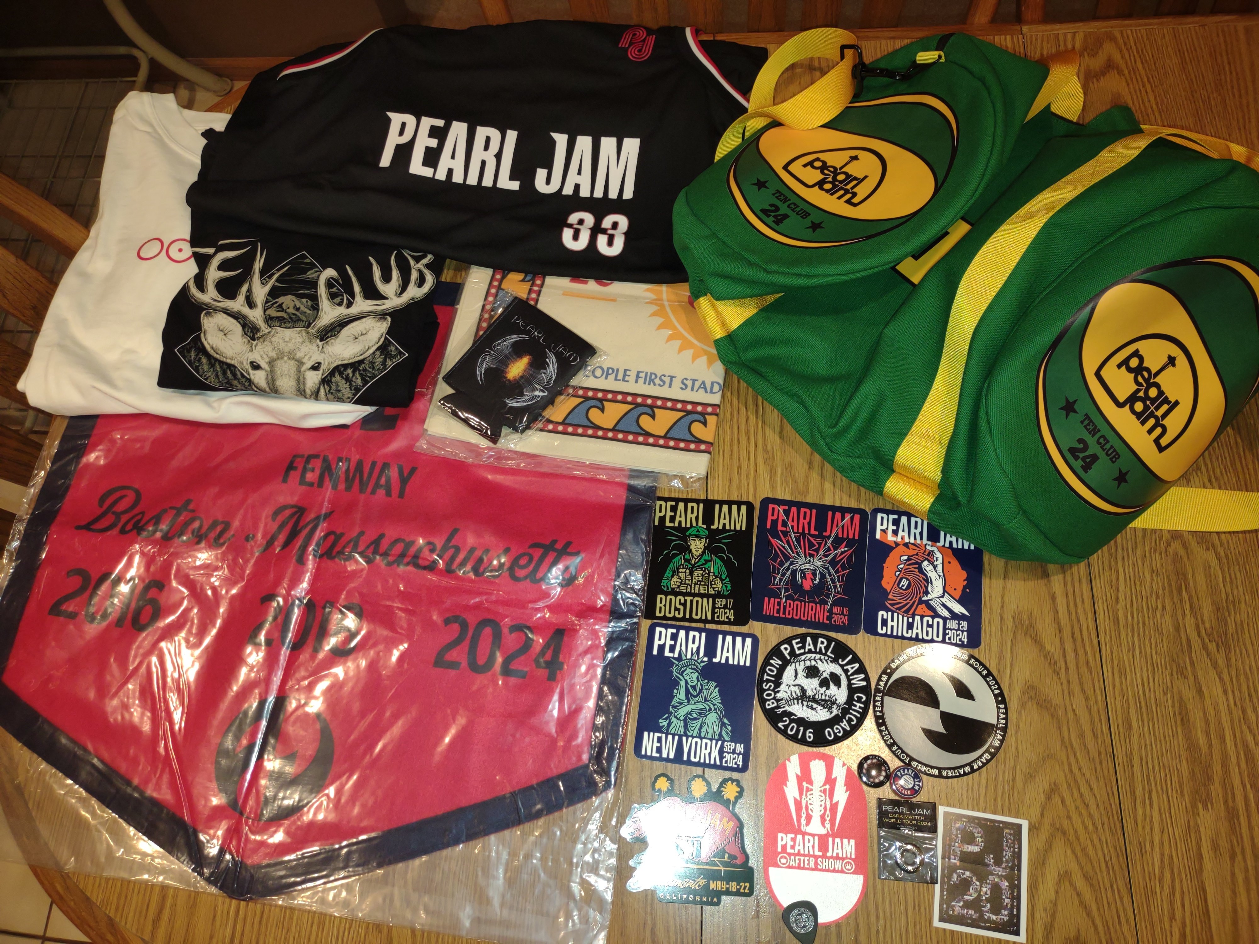 My Large bag arrived! Very happy with everything especially the spring 25 sweatshirt! Appreciate the Boston banner because I was at 2016 shows. Have a Wrigley pin but would trade pin for Nashville 2022 pin. This is my first mystery bag and so glad i finally did this. Good luck to everyone else still waiting!