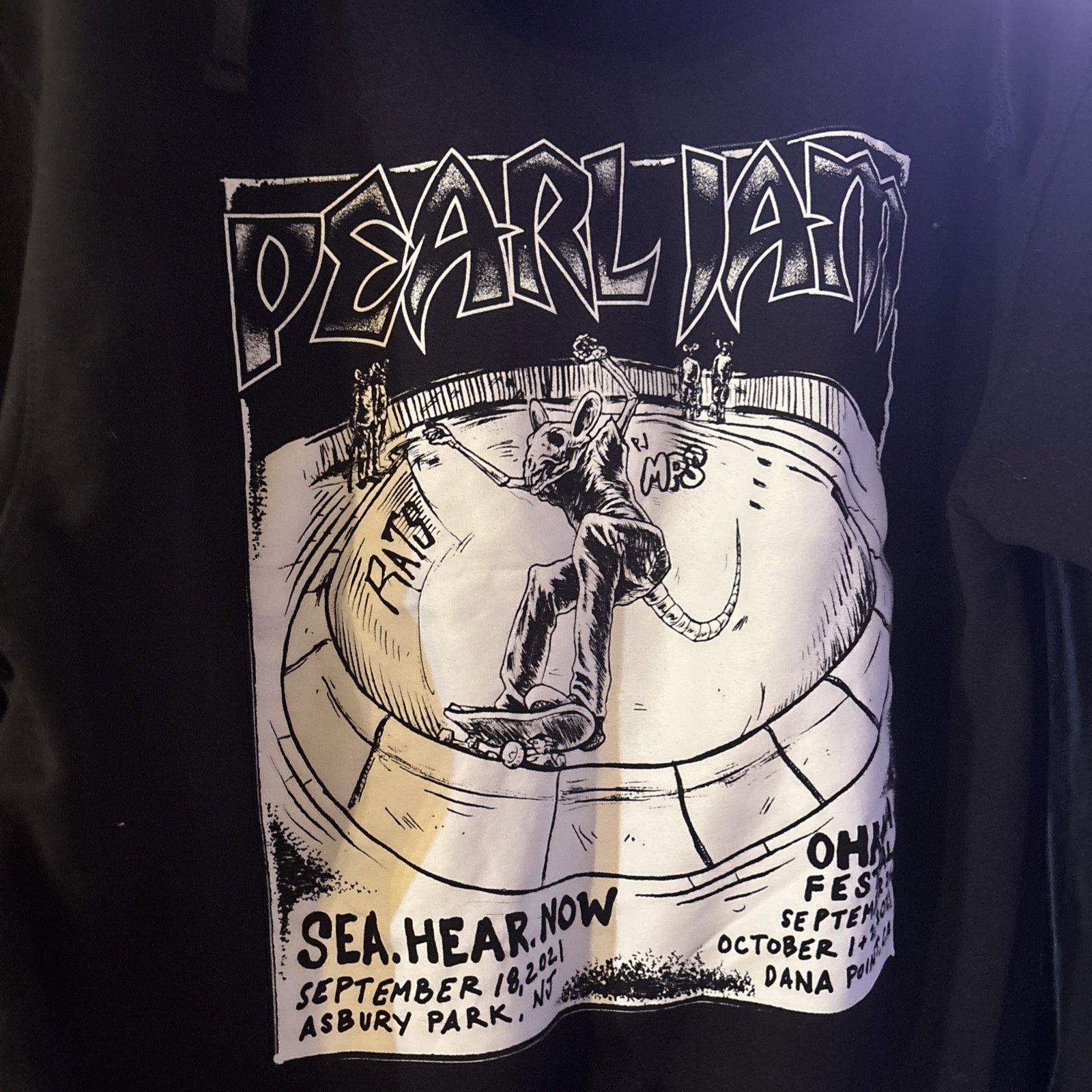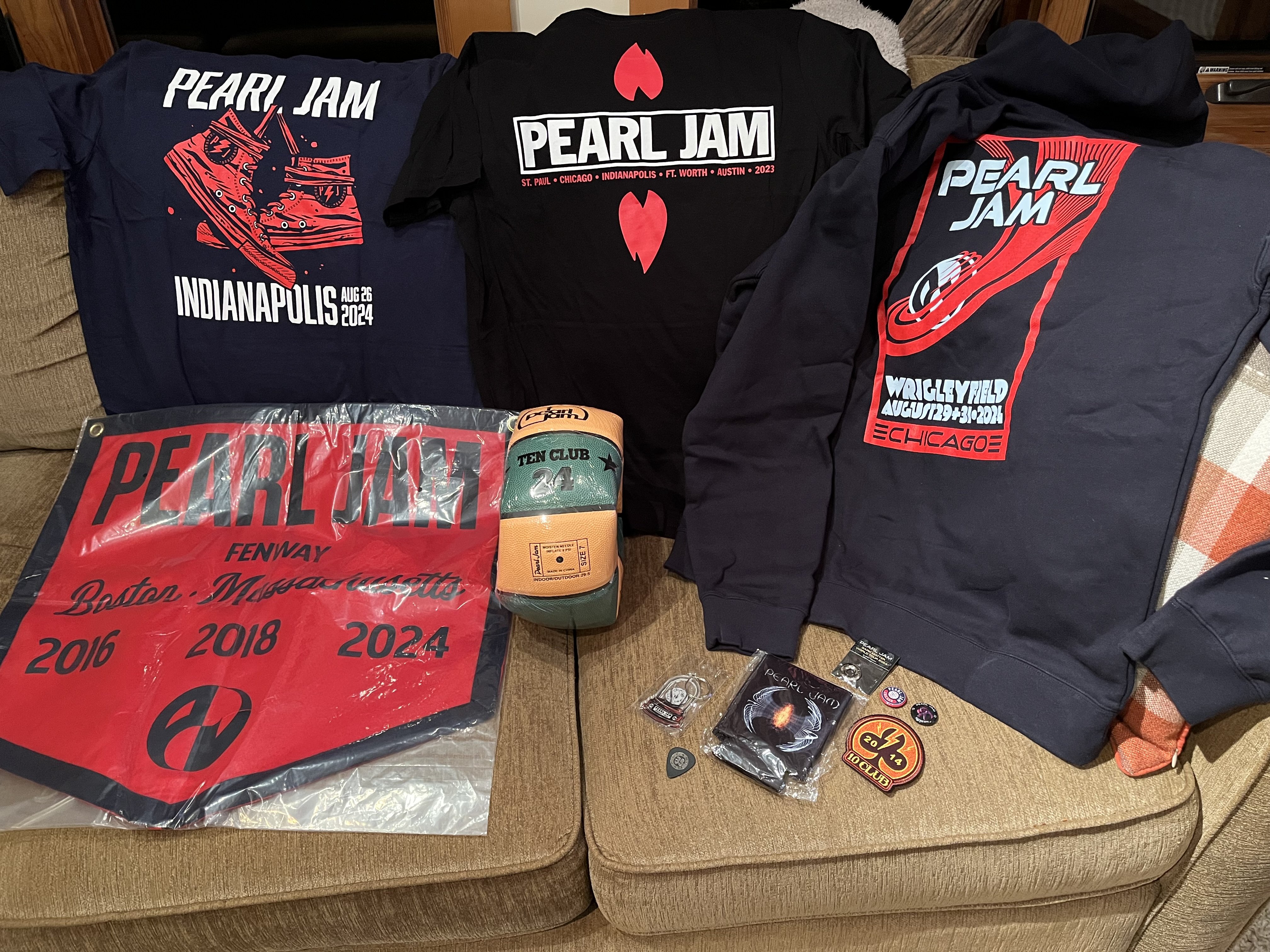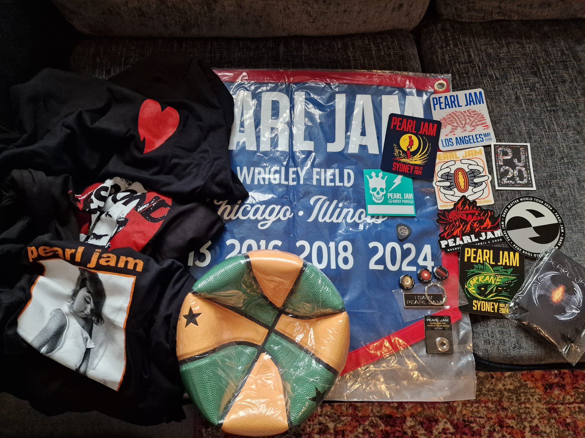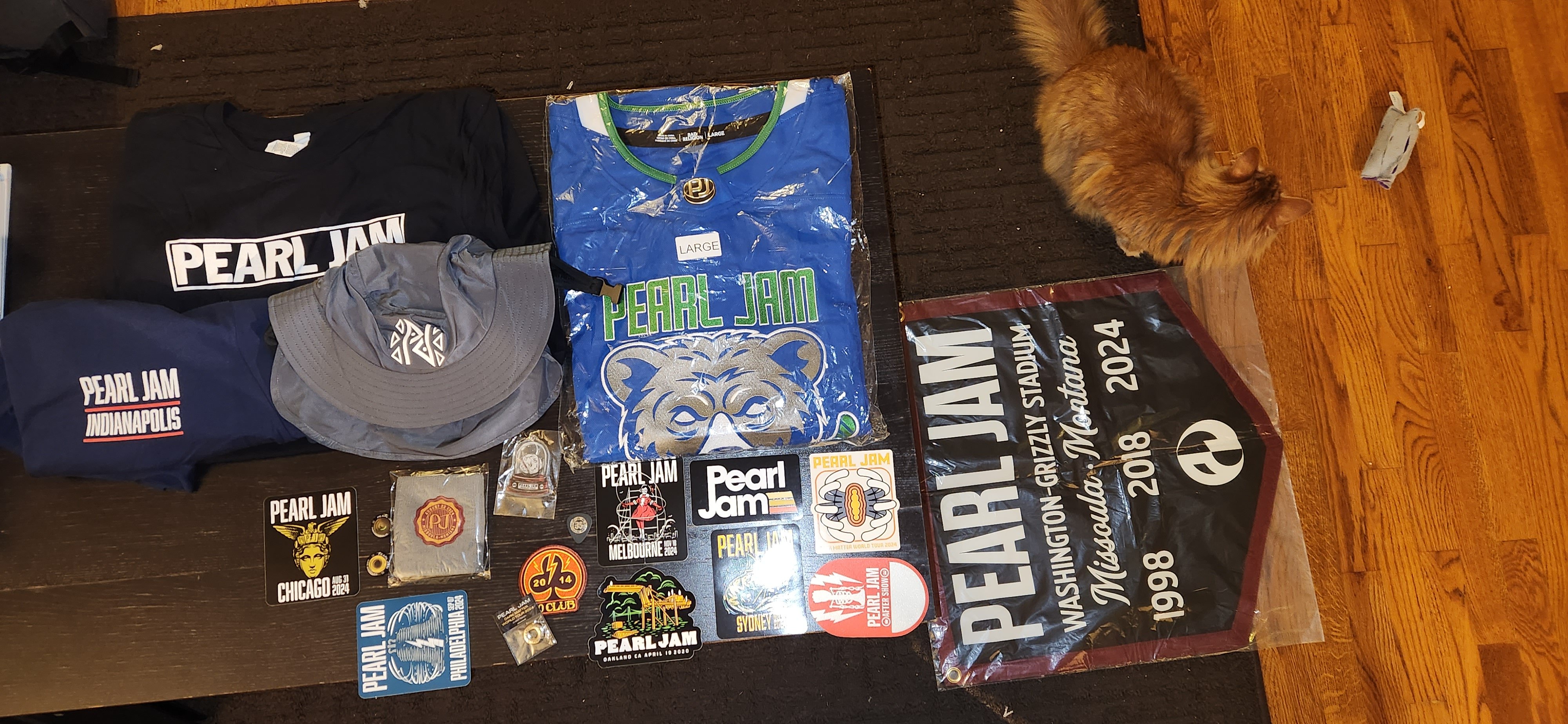 Got my Large Mystery Bag today.   My bar was low, I just didn't want one of those respond shirts. Pretty happy with my haul.  Missoula '98 was my first headlining Pearl Jam show and I've got the poster framed in the house, so kind of cool I got that banner. Albeit I also went to Wrigley '16, so I had a 2/3 chance of getting a banner that represented a show I'd been too.