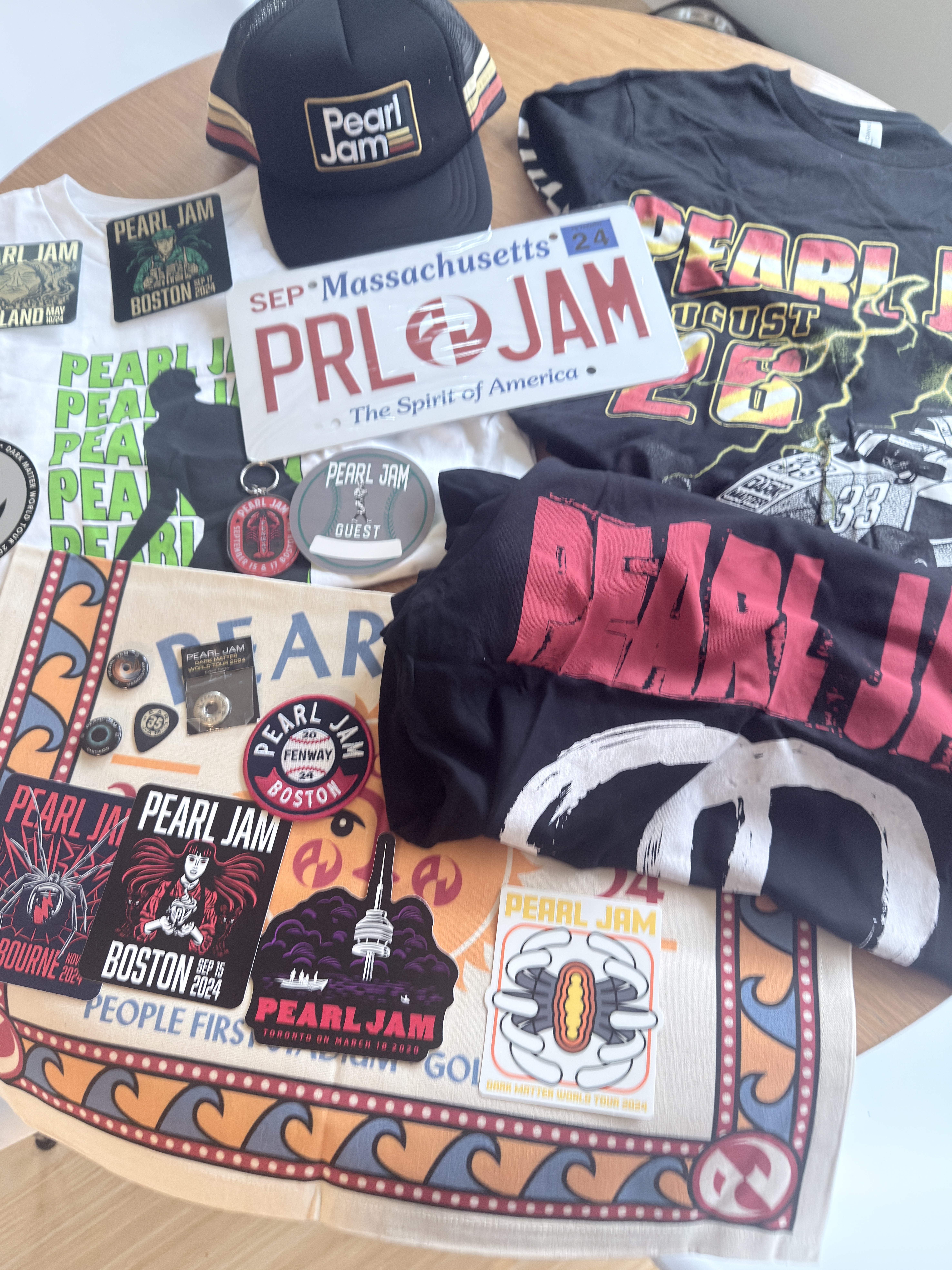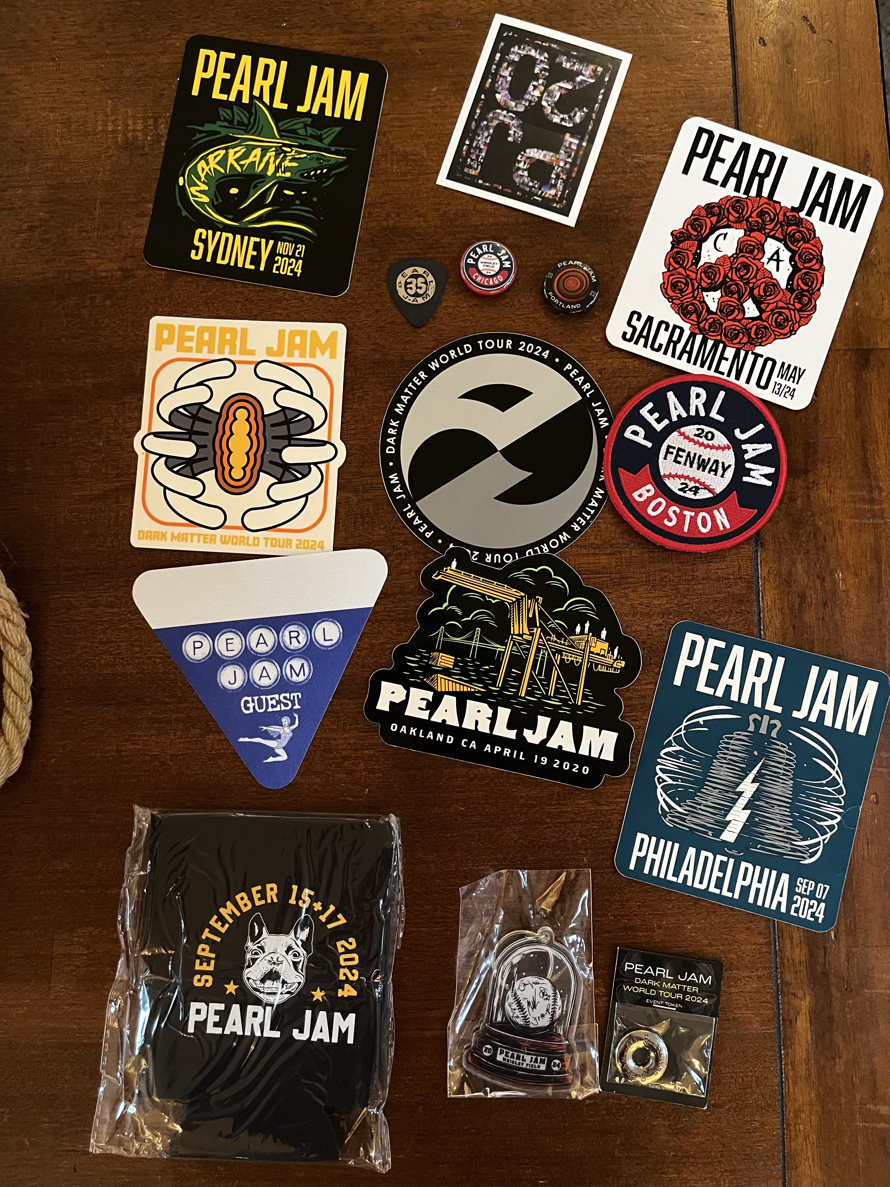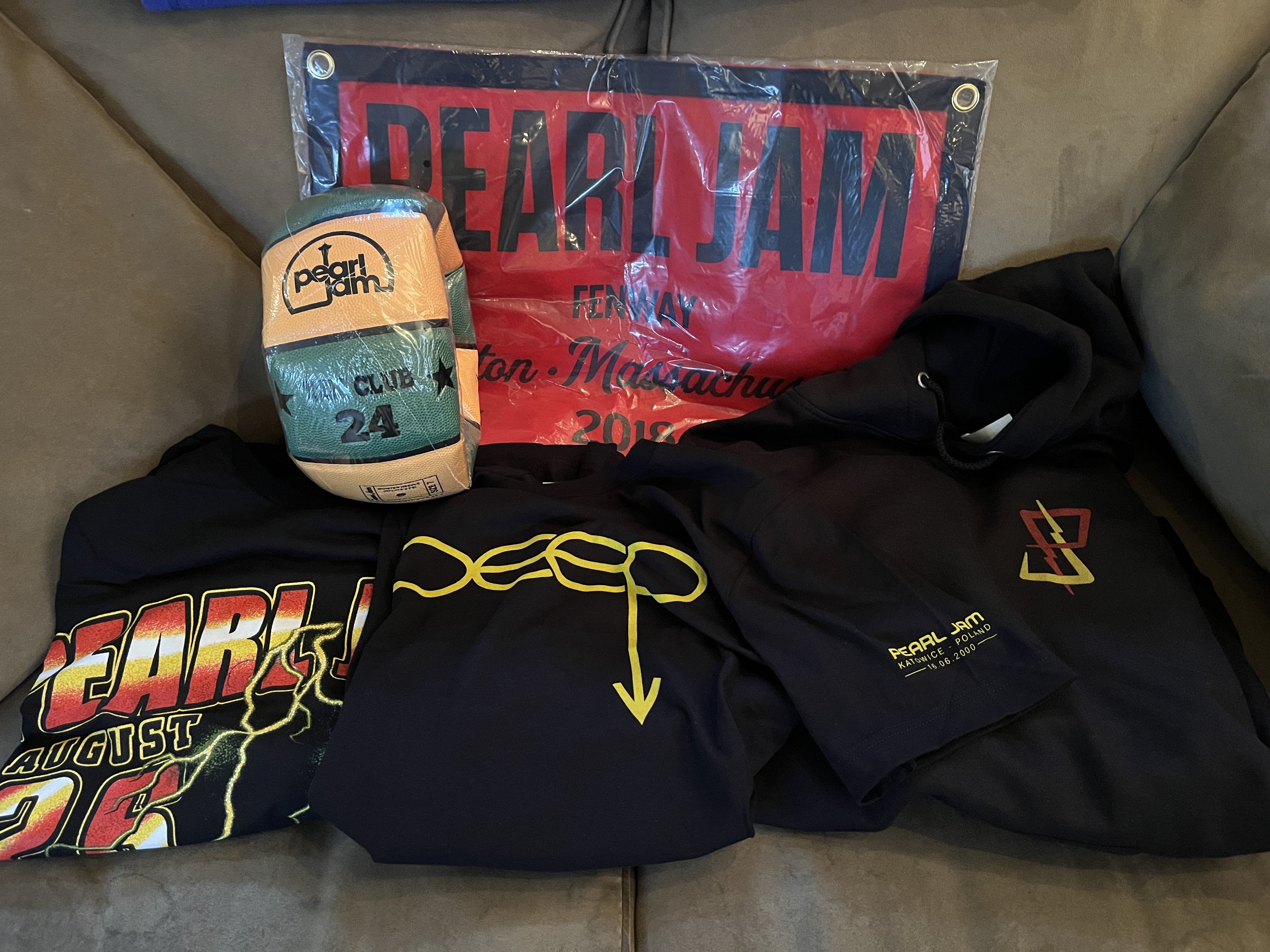 Men's M arrived yesterday. 1st time ordering a mystery box so I'm happy with what I received, though most items are available to trade if anyone is interested. Token is Seattle. Deep shirt is Katowice, Poland 2000 w/ setlist on the back. Dark Matter tour hoodie, Indie 2024 long sleeve shirt. Only things we're set on keeping is the basketball and any Wrigley merch. Things I'd be interested in trading for is Wrigley or Portland tour items or a trucker hat. Super cool that they do this. Felt like Christmas going through it!