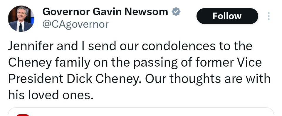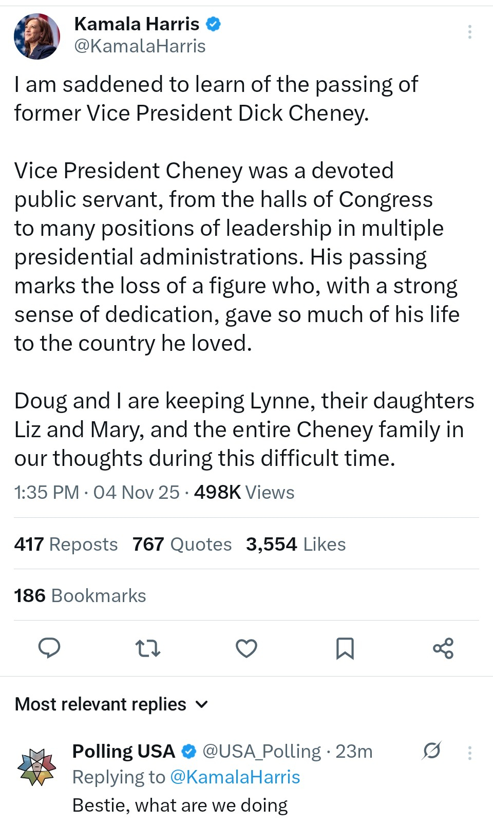 I actually do. I think she should have said nothing at all. Same with Obama, if he does say something. Some things are just best left unsaid! That man deserves no praise, alive or dead, especially from people who claim to be everything he wasn't.Yeah, and I'm saying they shouldn't, and I do put stock in it. It's bullshit, and bad people should not have good things said about them, especially not by politicians. And Cheney was a complete disgrace to humanity IMO. I don't respect anyone for carrying on that stupid hypocritical BS. And no, FYI, I don't do that.Harris should have kept quiet.Post edited by PJ_Soul onWith all its sham, drudgery, and broken dreams, it is still a beautiful world. Be careful. Strive to be happy. ~ Desiderata0 -