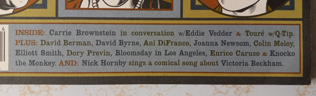 A nice copy of this McSweeney's publication. This "Music Issue has interviews with musicians and includes a CD (see photo below for song listing) Sorry no PJ or Vedder music on the CD, but it's a very cool compilation. And sorry for the reflection in the disc photo- those are my kitchen cupboards, lol).