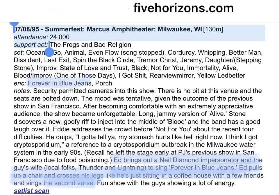 The PJ shows in 1995 were at at the Summerfest Amphitheater. Capacity 23-25,000. With 9,000 under the roof.