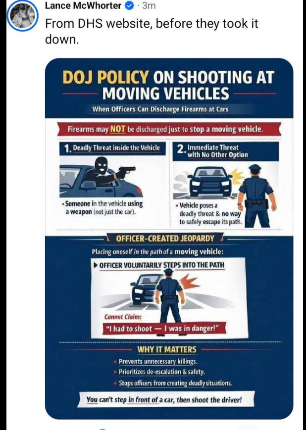 Since we are talking about facts, training, and escalation with the new video released you can see the agent was under no threat. Lets walk through the sequence:He exited his vehicle.A defense position protocol would have been to use the vehicle to block the threat or use for cover..He walked all the way around the vehicle film with his cellphone. (Notice no body cam footage)He talked to the driver, eventual victim, who attempted to de-escalate. She even said she was not mad at him.He engaged the second person. No threatBy now he had all their information.He is told as much and he knows he has no authority over lawful citizens which clearly irritated himHe then switches hands with his cellphone to free his gun hand after he didn't like being told to move onHe against all protocols and standard operating procedures moves in front of the vehicle to stand because he was sure he could dominate the two women.This is where we see clear poor training, bad intent, and abuse of power.He made a decision to change his behavior and assume an aggressive positionHe encourages escalation from other agents.He then pulls his gunThrough the windshield the driver can be seen turning the wheel all the way to the right until it stops to avoid any contact.He knew there was under no threat. He watched her with his gun drawn.He leaned into the vehicle to shoot while still recording with his cellphoneHe is bumped after shootingHe never falls, or even loses his phoneNo one carrying a cellphone would ever be trained to shoot while doing so.He then curses at her after shooting herThen doesn't pursue despite claims she was a threatThen leaves the scene against protocolThe rest of the ICE agents on scene refuse her medical attention afterwards ensuring death.This is unlawful use of lethal and excessive forceIn real time its blinks of an eye. This is a tragedy. It highlights why training is critical.Why those with authority hold a responsibility to be responsible members of the community and citizens.It reveals how tough the job law enforcement does each day is.It highlights there are a lot of good officers and agents.It reveals this murderer is not one of them.It also reveals the destructive nature of the current administration, their lack of honesty, and clear disregard for human life or public safety. Their responsibility is to tell their force to be conscious as citizens, or protect the population Instead they say keep going you have "absolute immunity." They are escalating lawlessness.Remember you only need immunity if you know you committed an illegal act.Your boos mean nothing to me, for I have seen what makes you cheer0 -