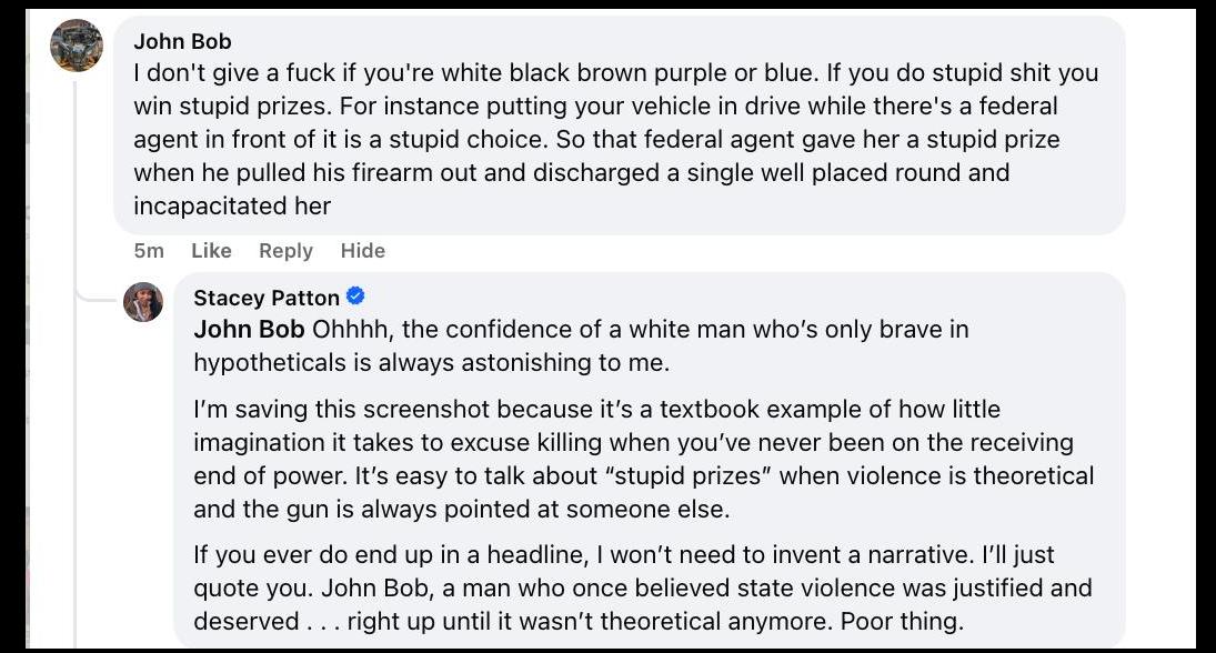 And how do we get civilians to behave better in these situations? Well, don't be fucking monsters and antagonize the public. The resentment of the public and the backlash to ICE exists because the admin and the people they have sent out absolutely REVEL in antagonizing people up. They wanted a response like this. They were and are gonna keep pushing and pushing to do more of this.