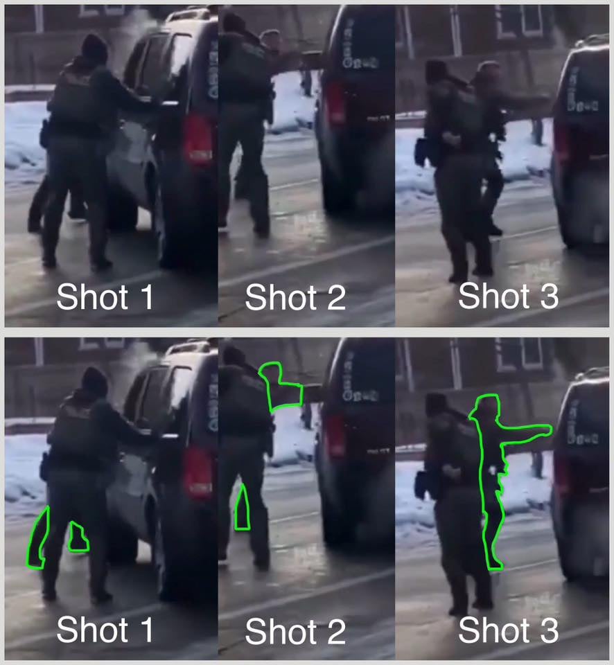 I will say I believe if the first shot is justified, then the second and third ones are as well. If you justify one shot, then I don't expect the threat to be completely eliminated and the shooter to process the new information in the 0.45 seconds the whole shooting took place. So that's Why I'm just using the frame of the first one.