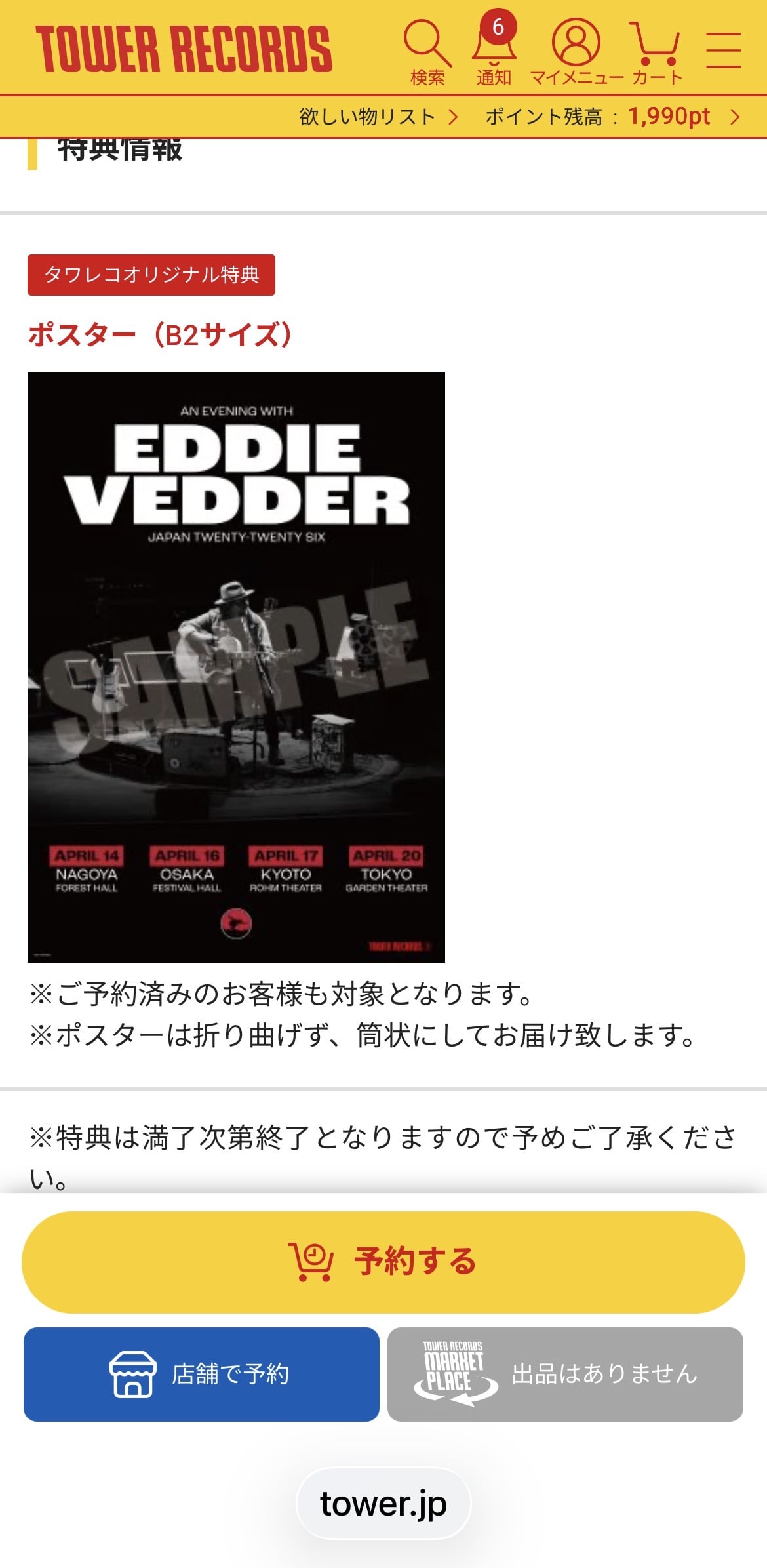 A free poster comes with Budokan live or earthling tour edition purchase at Tower Records.