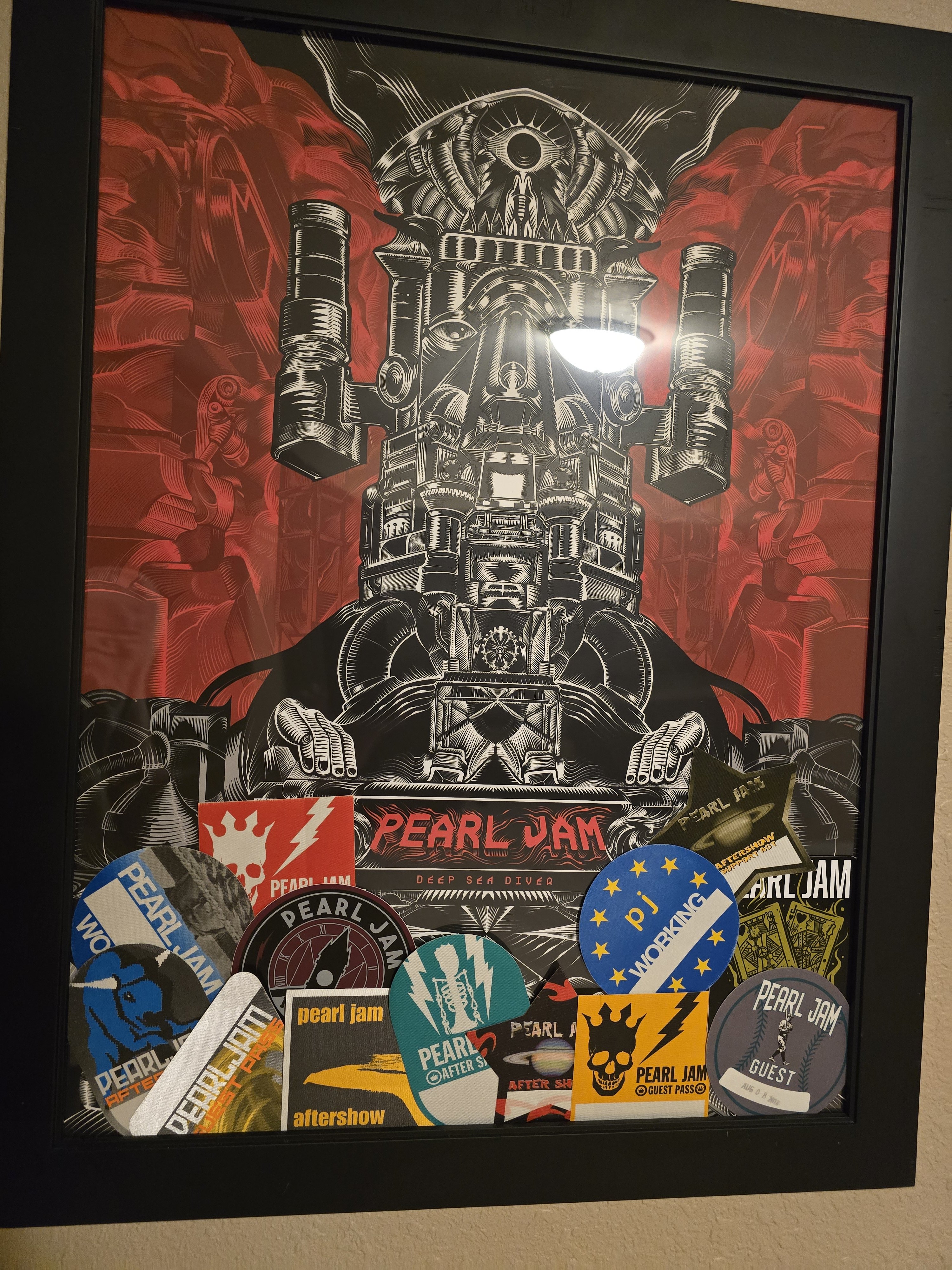 Under glass on a table? Serving tray? Put on a yield sign? Old skateboard? I like to leave my stickers unstuck [they are pj artifacts to me], but if you figure something good out sure you can stick them. Maybe frame a pj record cover with the stickers all around. That would be neat!