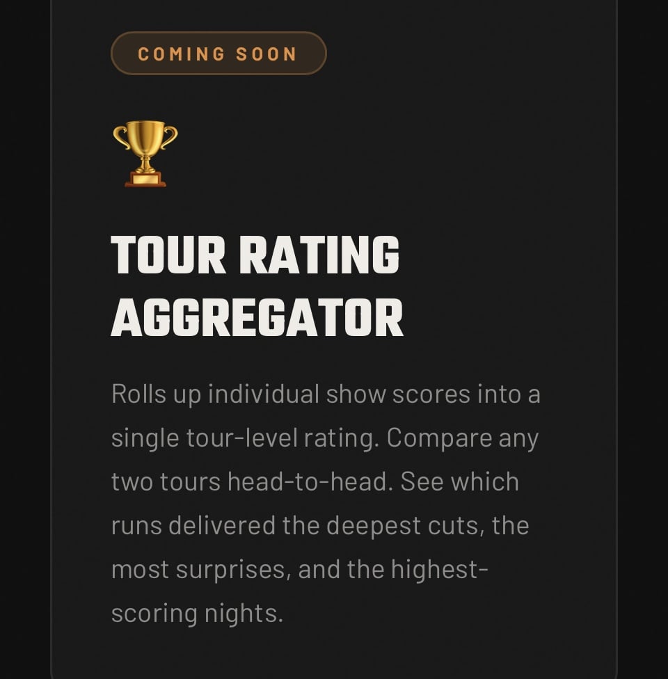Some things I'm thinking about tackling next: See your personal rarity score, bust-out alerts, overplayed/underplayed analysis against your own attendance. A Pearl Jam oracle trained on all of this data that can answer the weird questions. This is v1. There's a long road ahead and lots of different ways to expand its current scope.