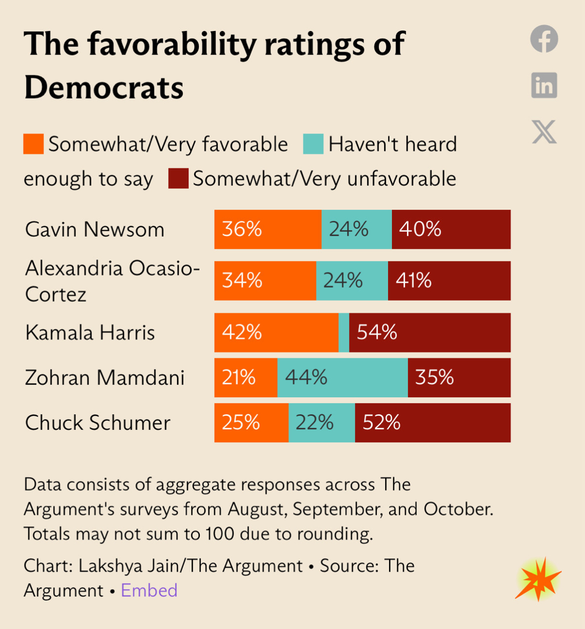 ” Once you account for just how blue New York City is, Mamdani’s numbers in his race look considerably less impressive. The recent AARP-Gotham Polling poll of the mayoral race found his net favorability to be +3, with 48% of respondents expressing a very or somewhat favorable view of him and 45% expressing a very or somewhat unfavorable one.In a city where Donald Trump received just 30% of the vote in 2024, those are not very promising numbers. They also do not make a compelling case for him being a Democratic Party instruction manual.”