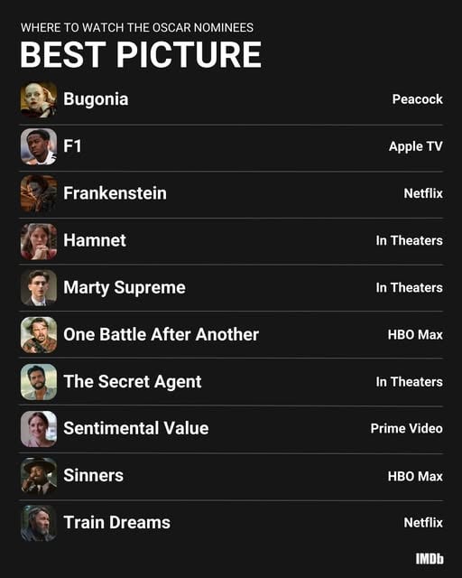 Going to try and knock all these out before the Oscars. I've only seen F1, Train Dreams, and One Battle After Another so far."For when the music hits, I feel no pain at all"