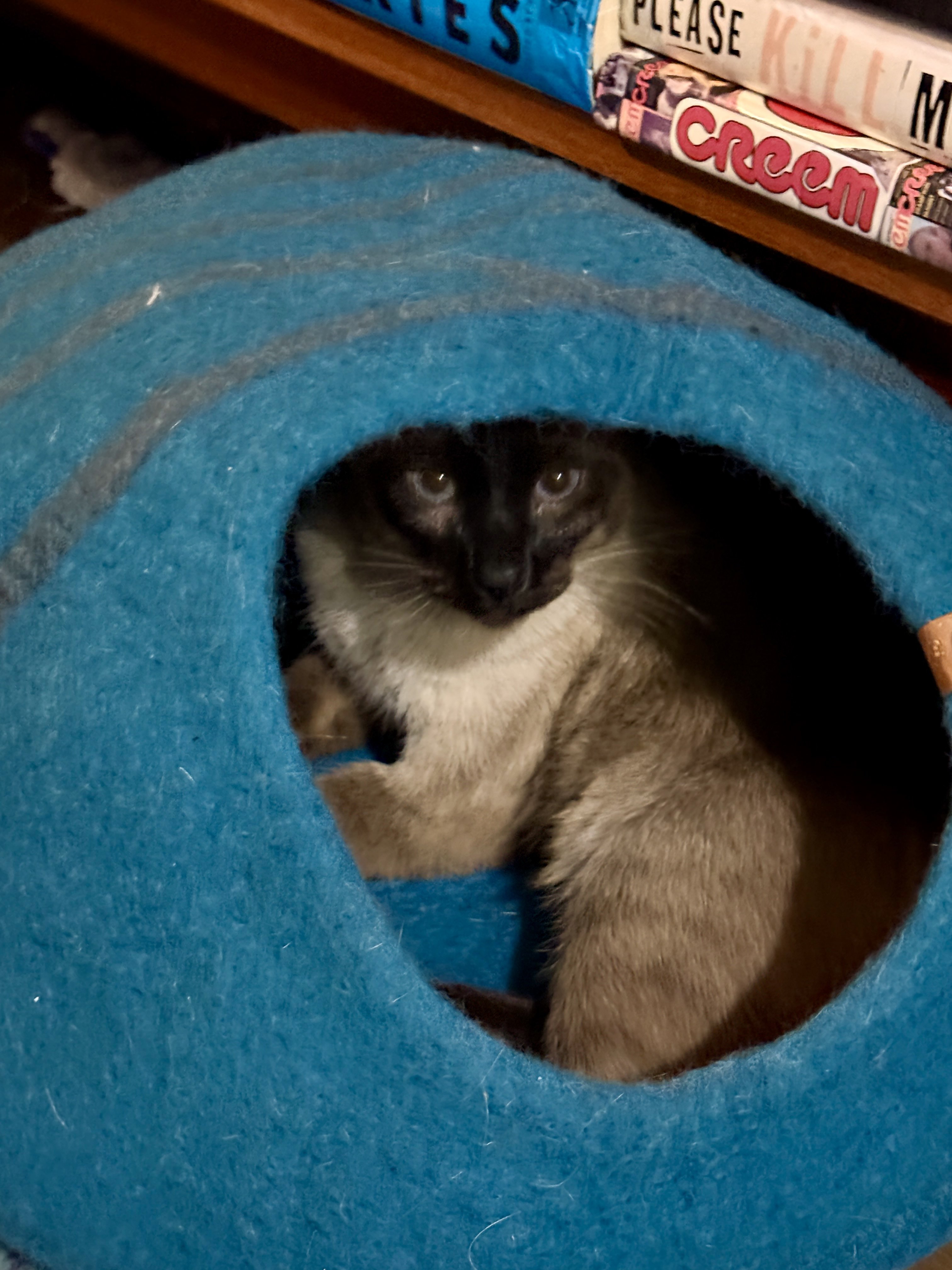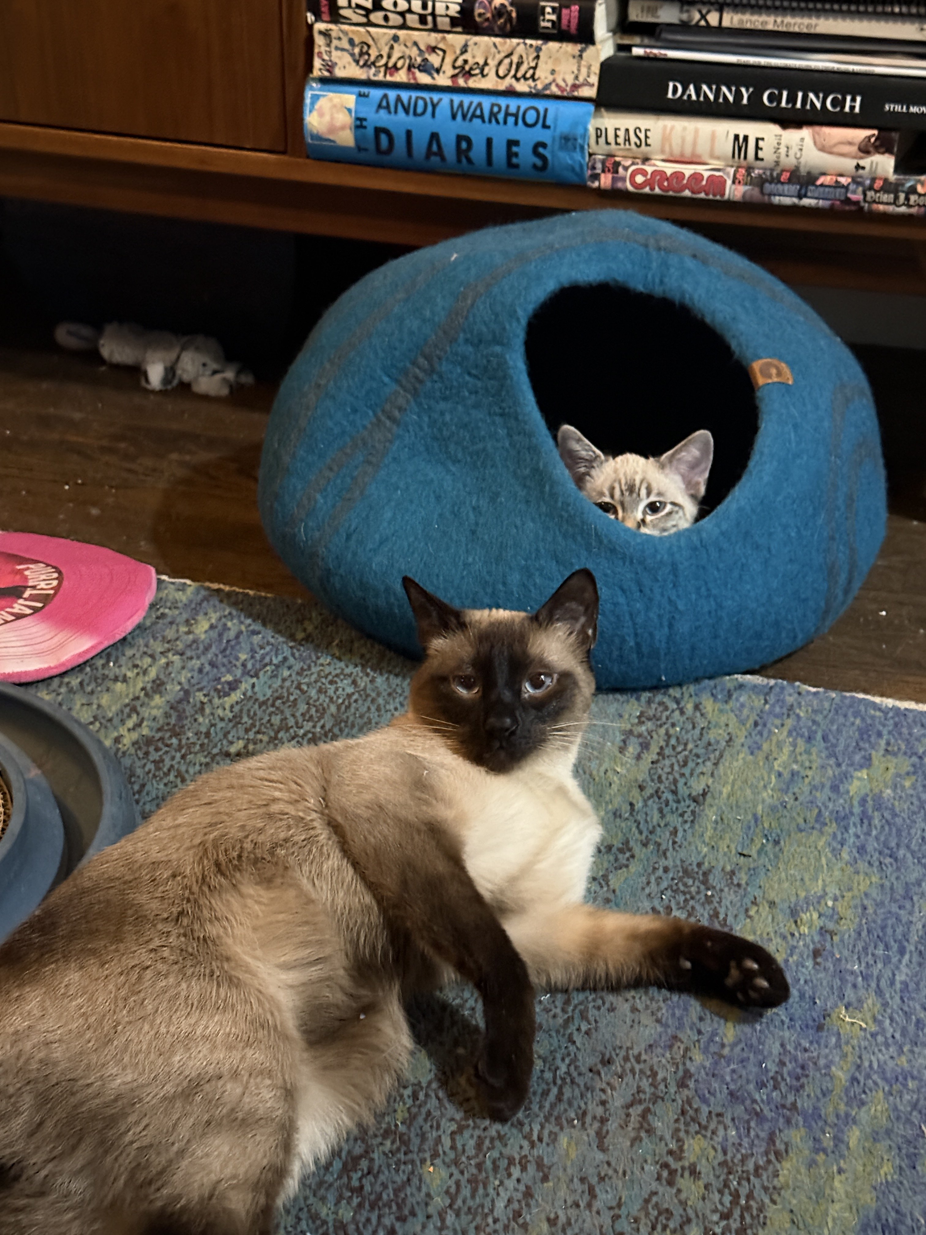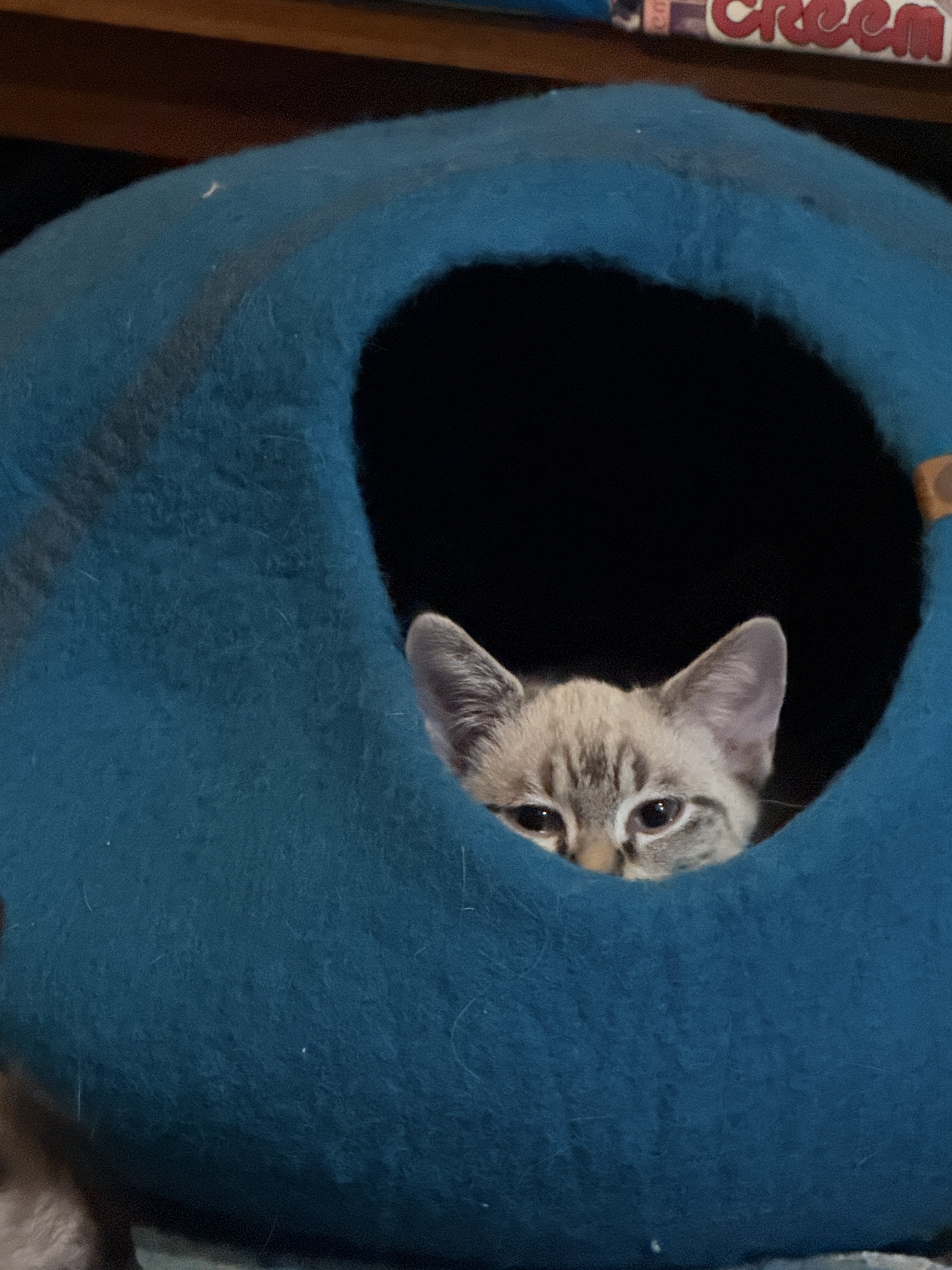 I just got this cool cat cave thing. It is made out of wool. They both love it.