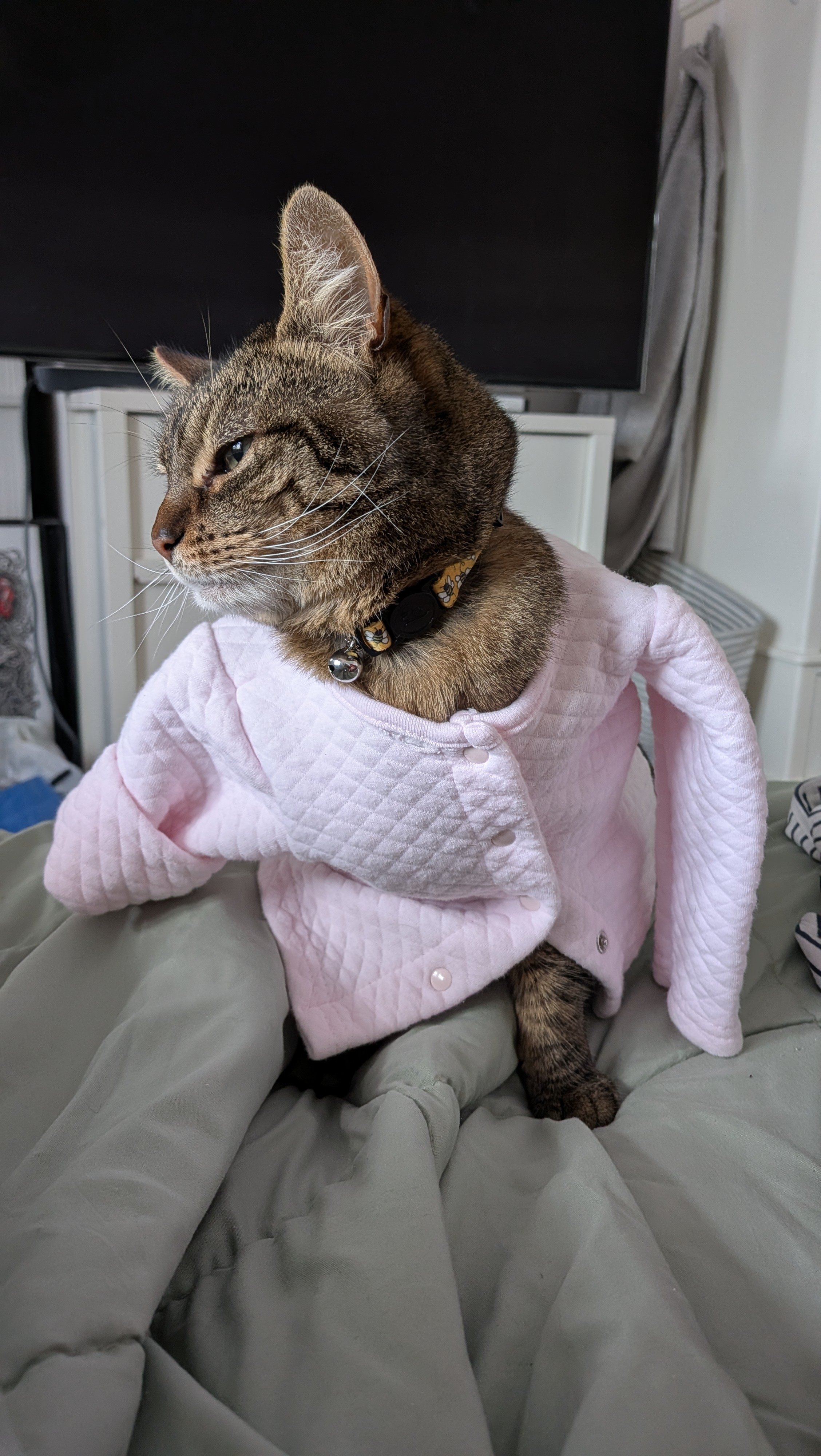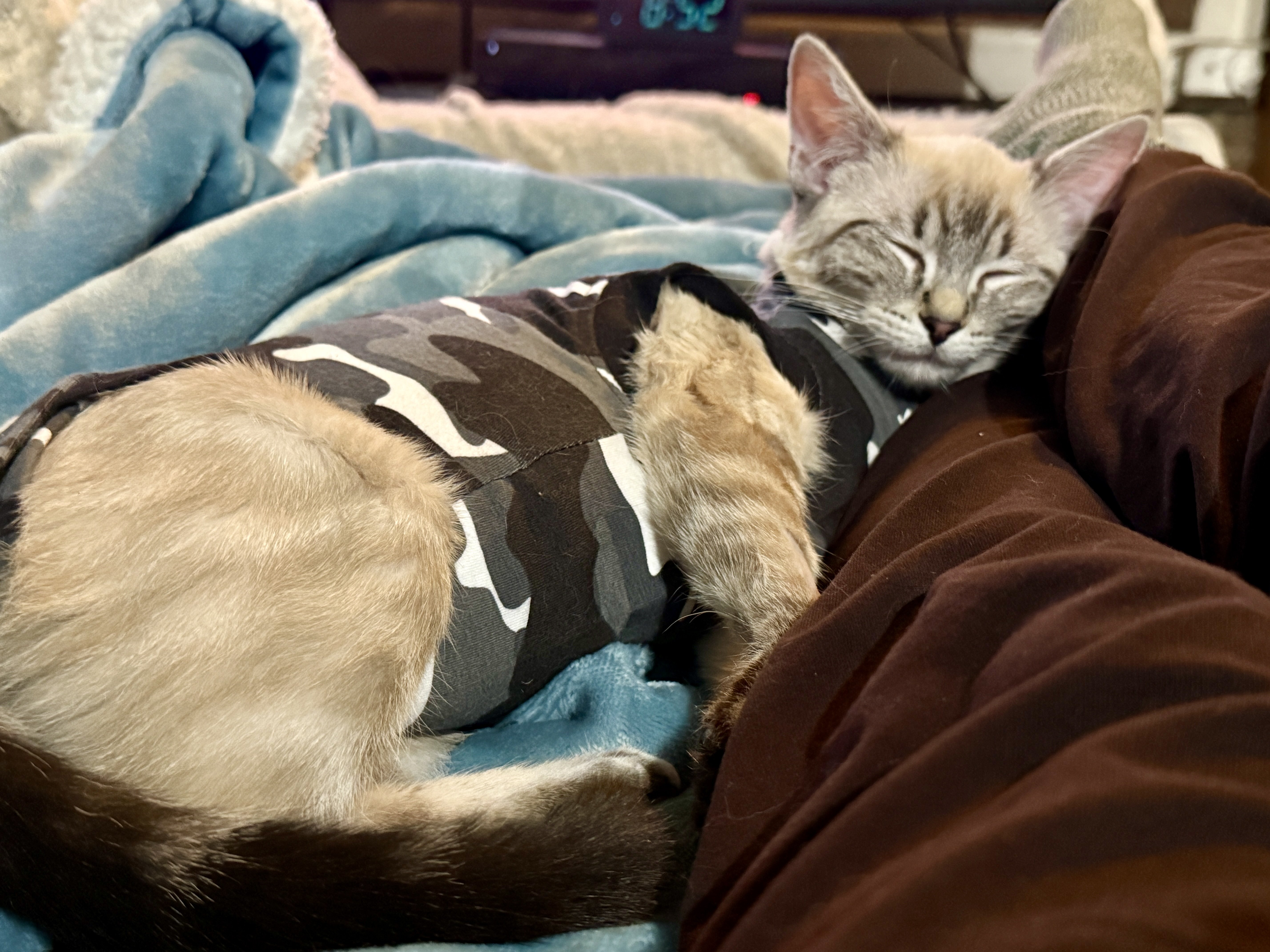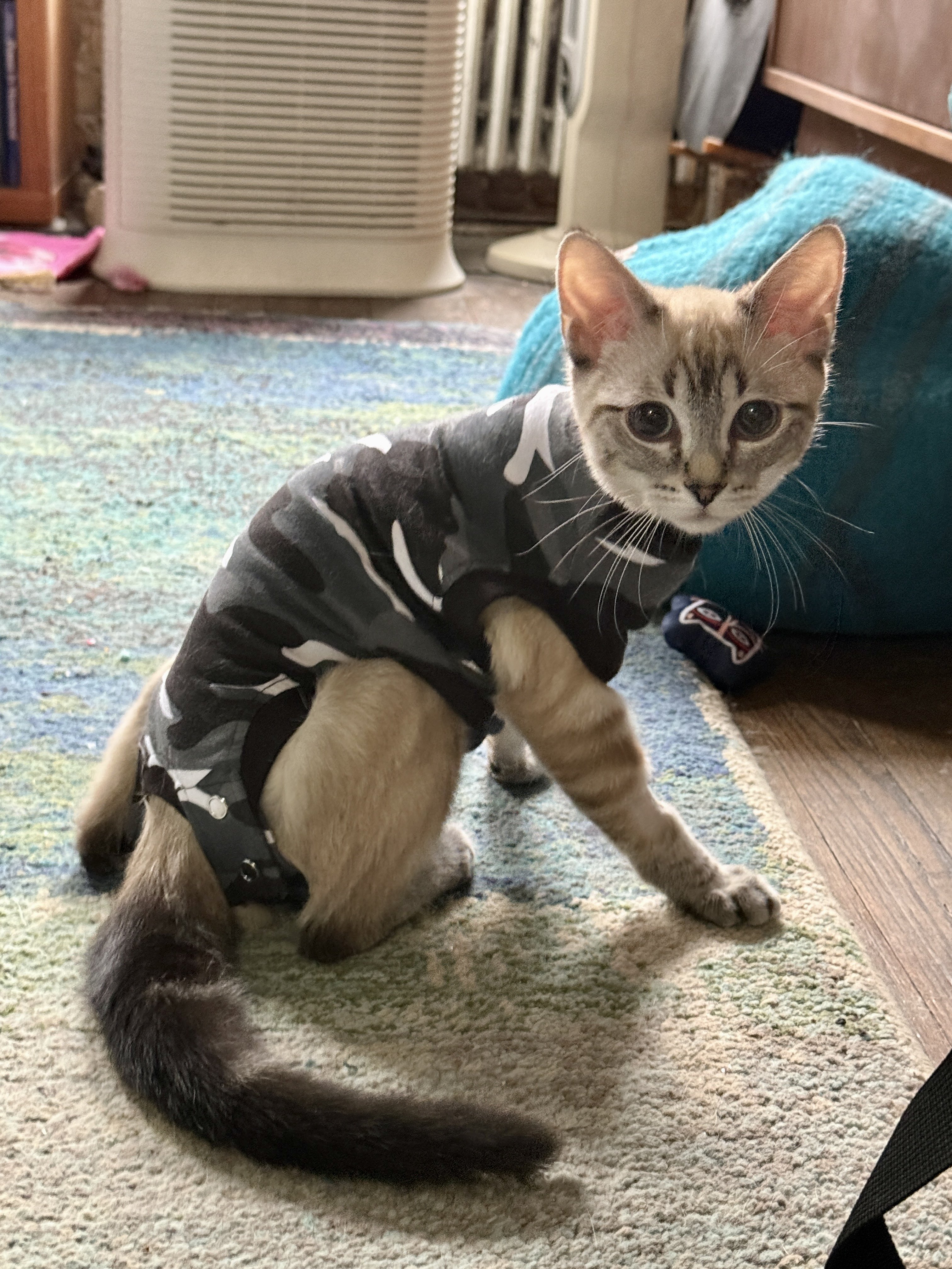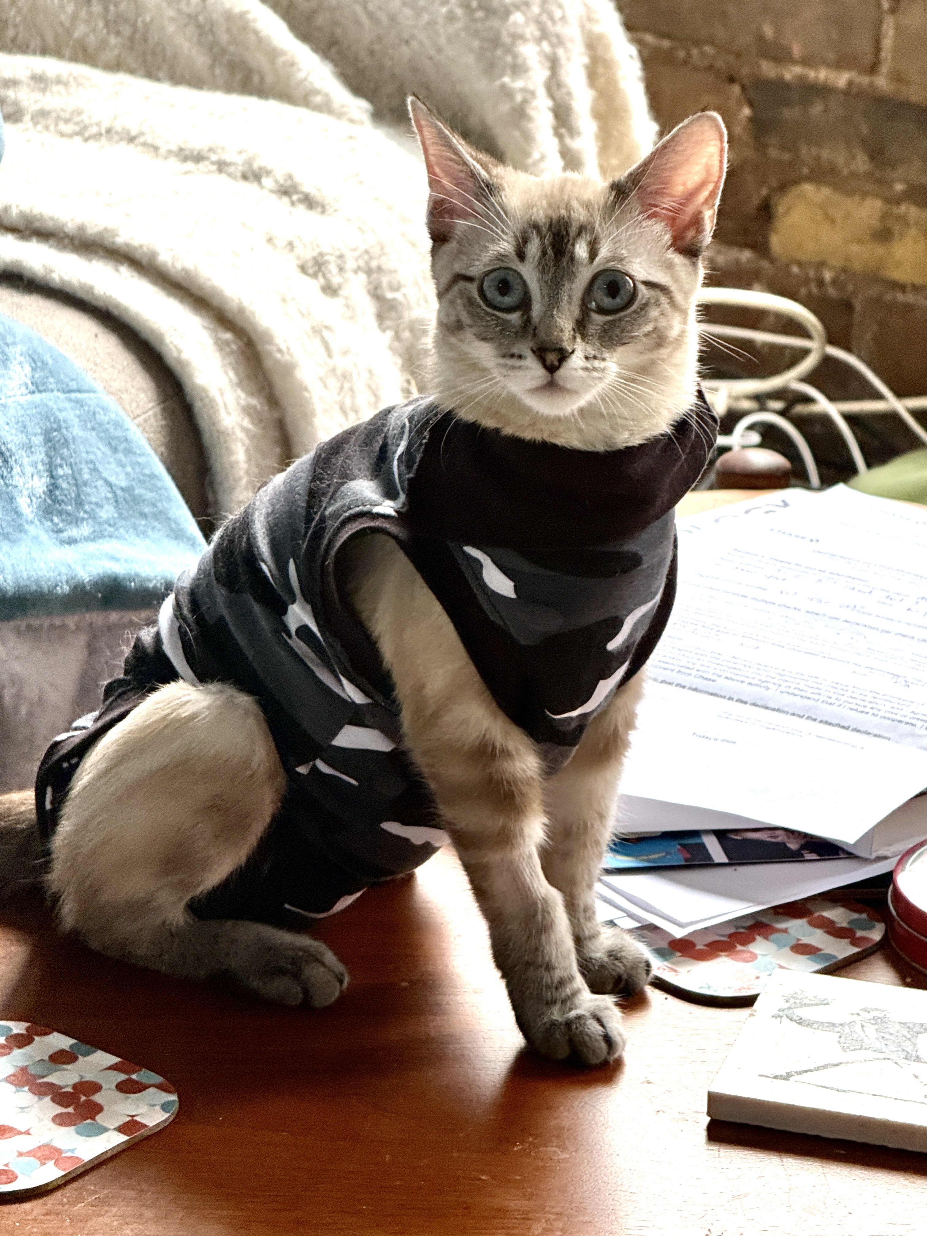 Still a bit groggy from the spay. She seems to be handling the onesie ok for now. A little badass in her camo. Lukin doesn’t recognize her smell right now. He is hissing and growling and puffing his tail at her. But that should calm down soon.