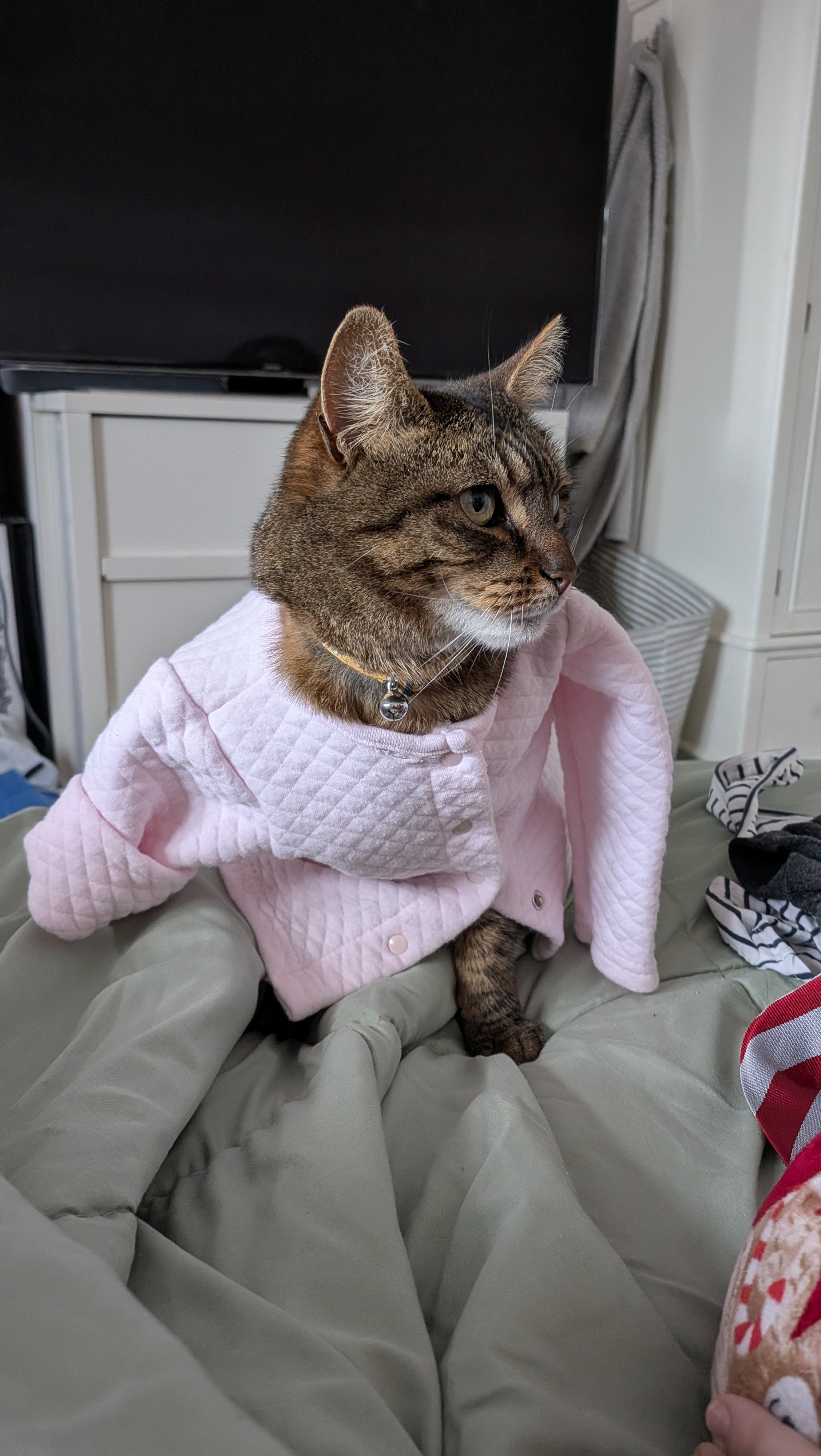 Very dapper. My daughter dresses her up and she just lets her. Still so grateful to have her home. We got gifted a tortoise and she likes the warm lamp