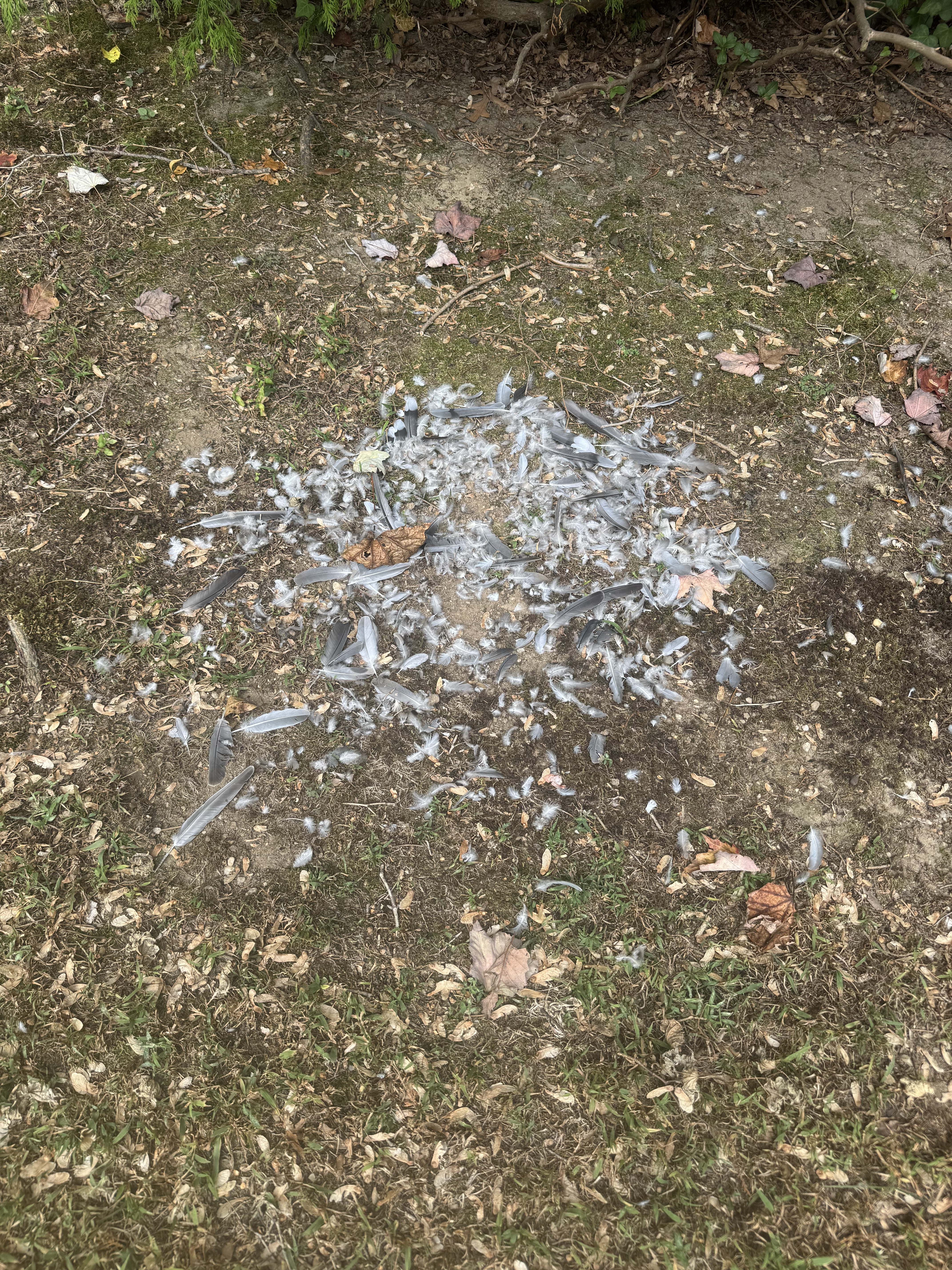 Anyone wanna take a guess on this? My backyard this morning … probably a hawk I’d guess… those feathers are pretty big