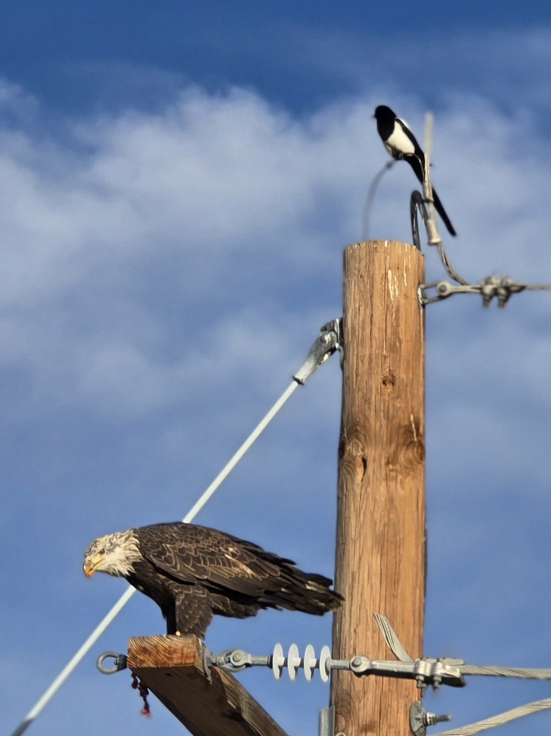 Happened on this today. Dirty Eagle having an afternoon snack while his friend waits for leftovers.