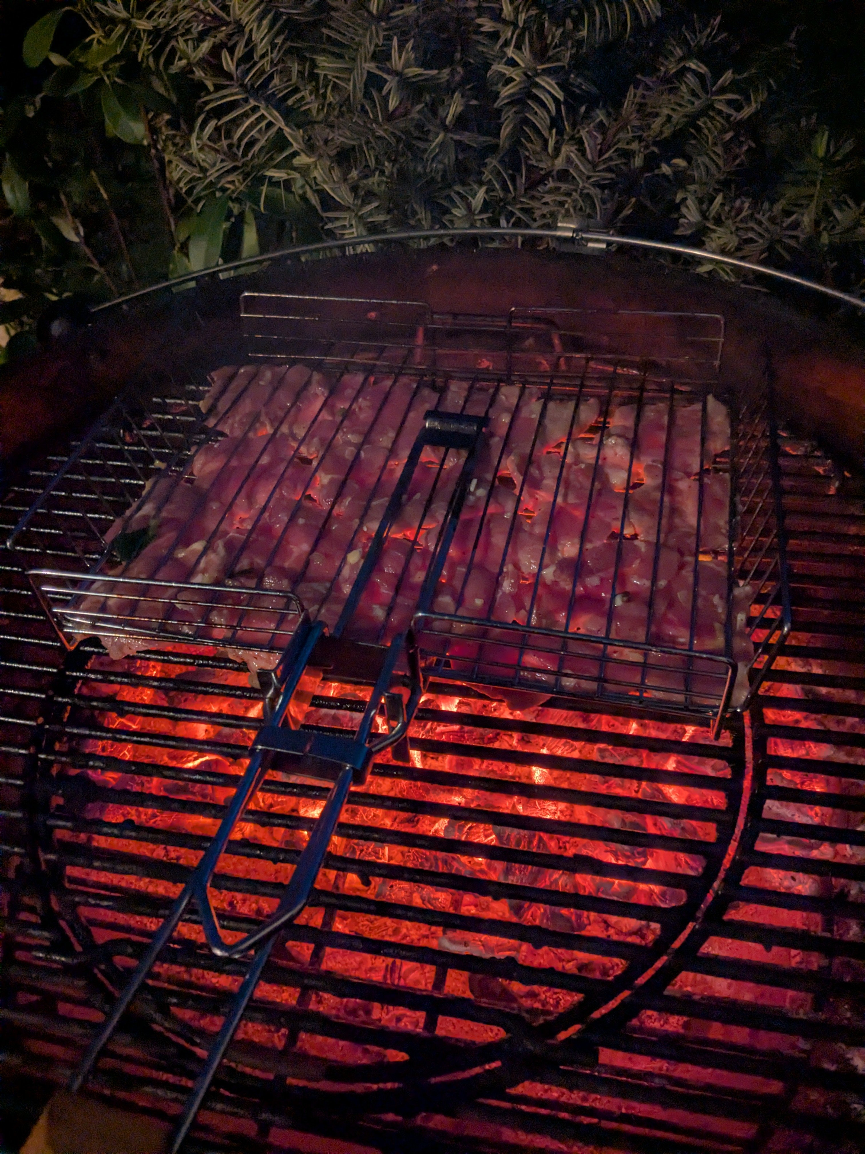 Grilled over charcoal. I put the patties straight onto the grill, use a wire basket for the thinly sliced pork shoulder.