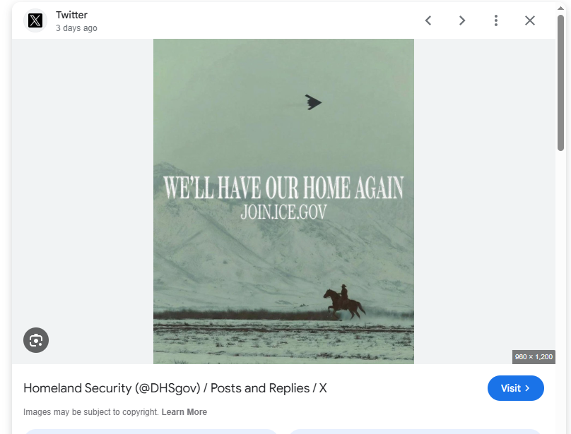 So, in case anyone was wondering just how nazi-ish this regime is, just look at the Department of Homeland Security's own twitter page. They have an ICE recruiting post that shows a join ice link, along with an audio of a song called "We'll Have Our Home Again". A post civil war KKK anthem.